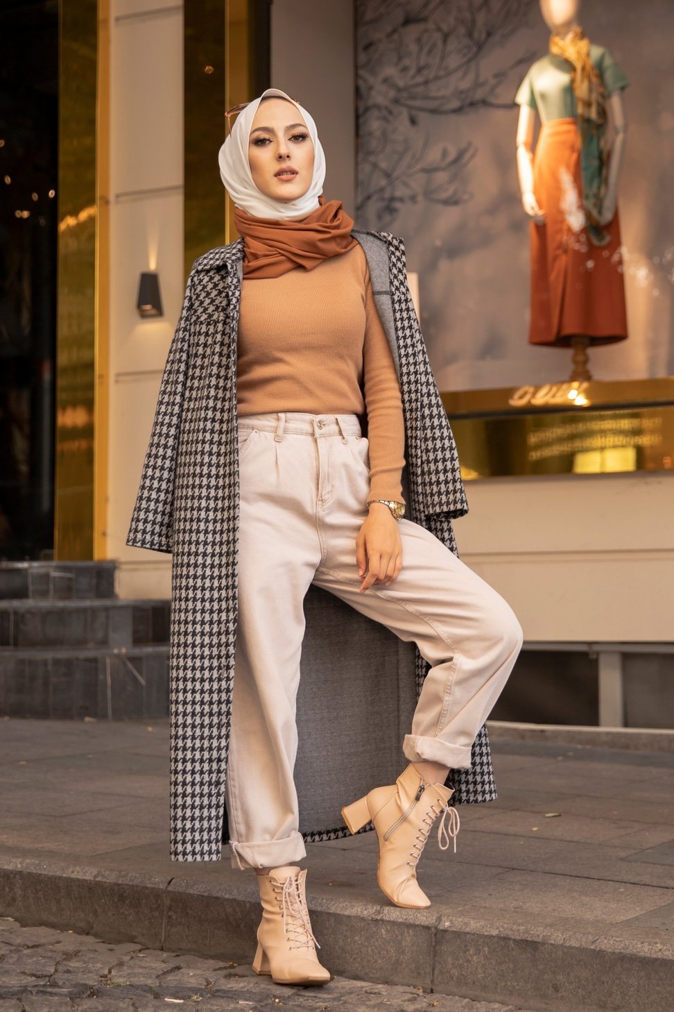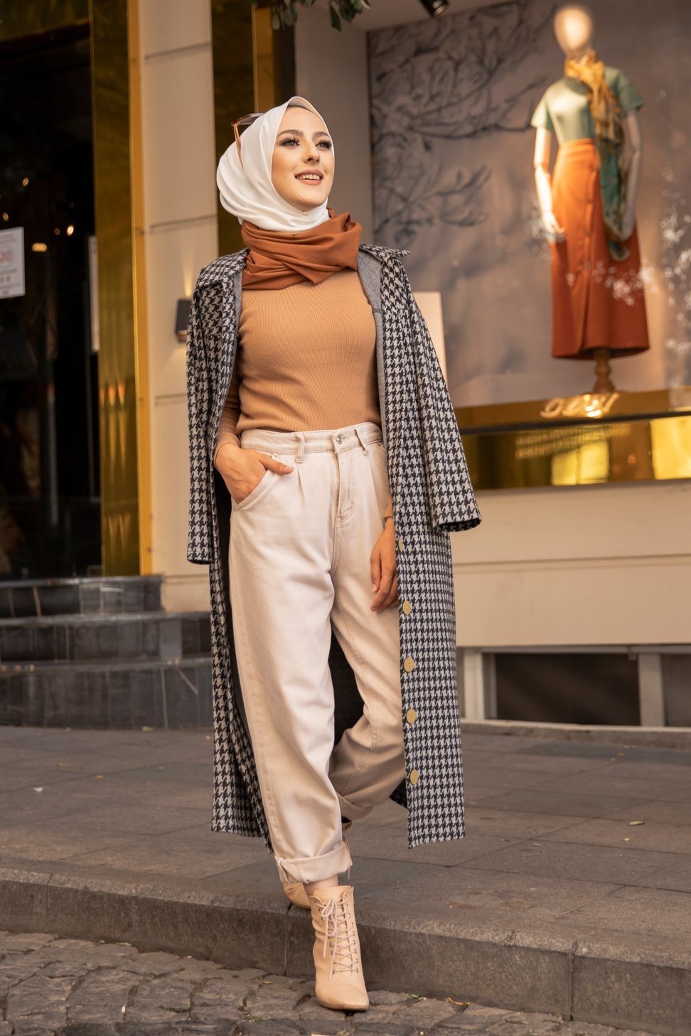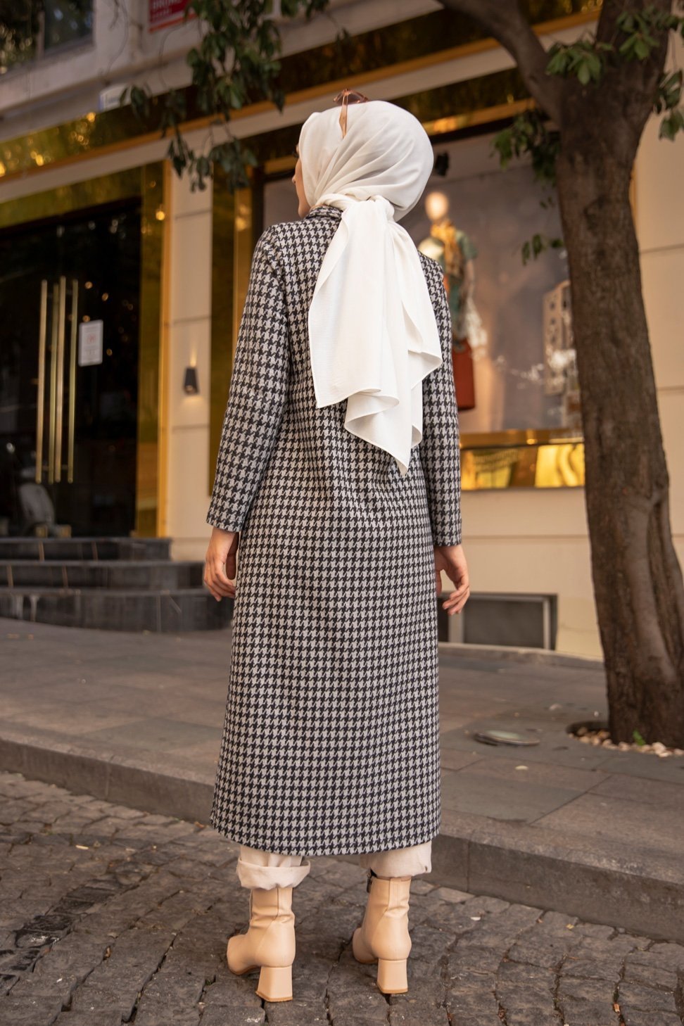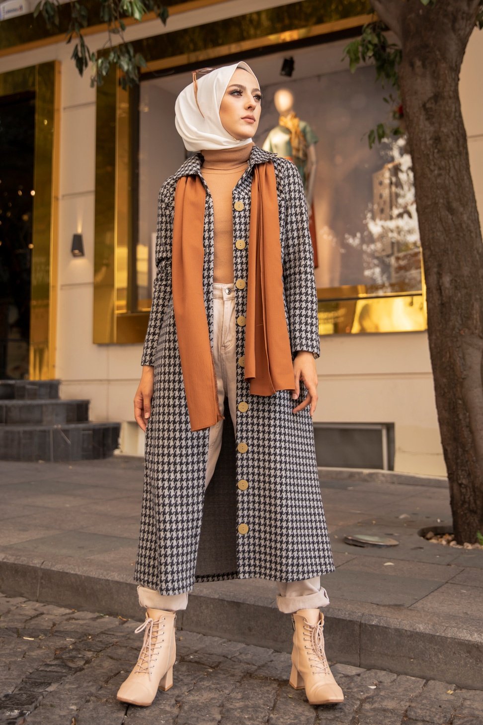 Tunique longue boutonnee a carreaux pour femme (Vetement Hijab Automne-Hiver) - Couleur gris