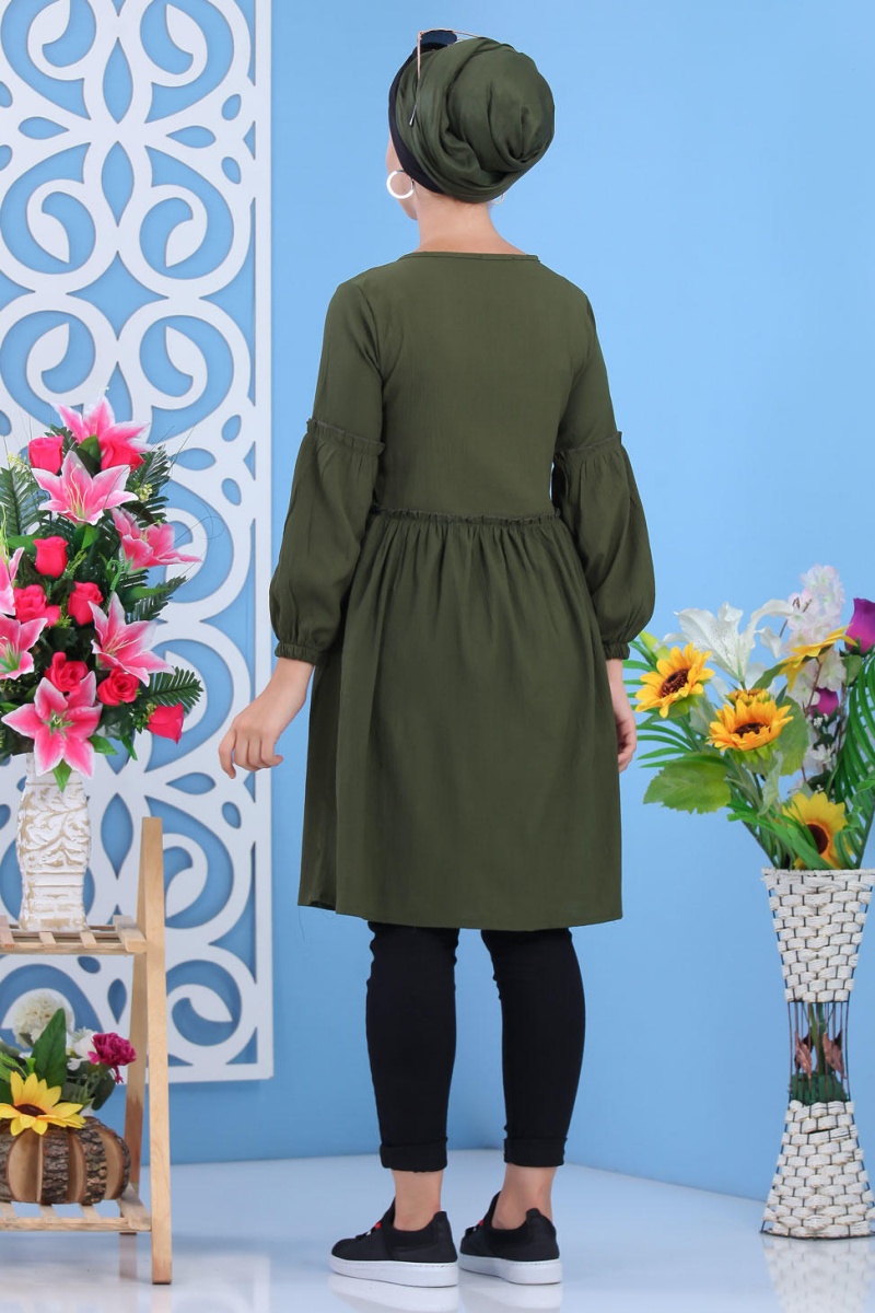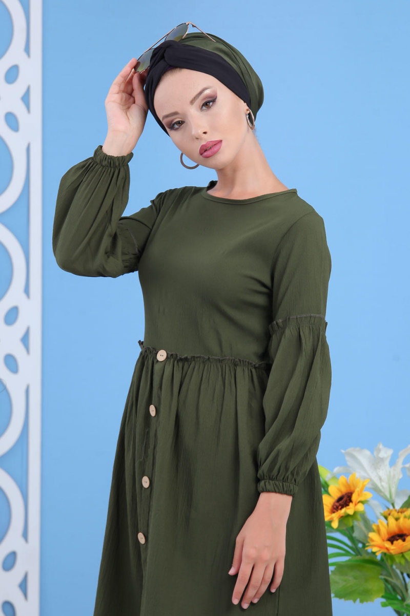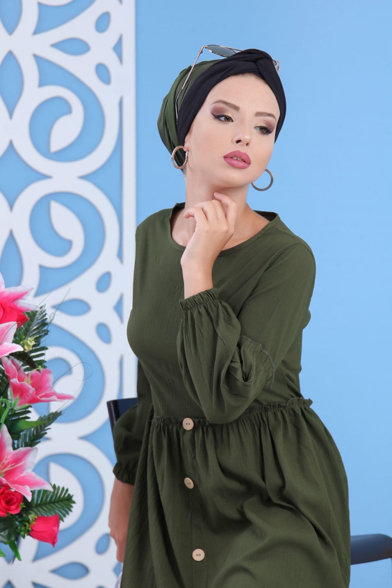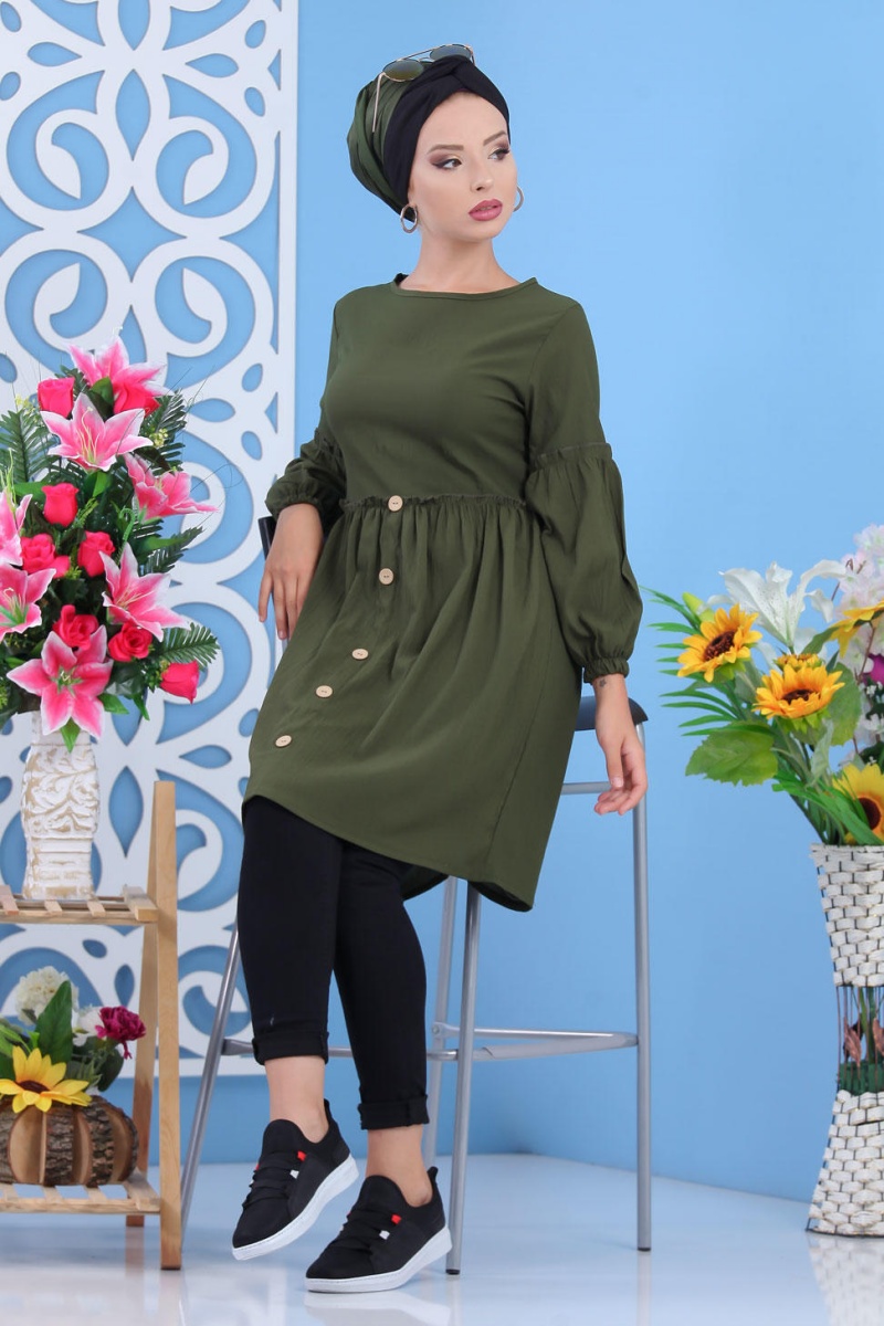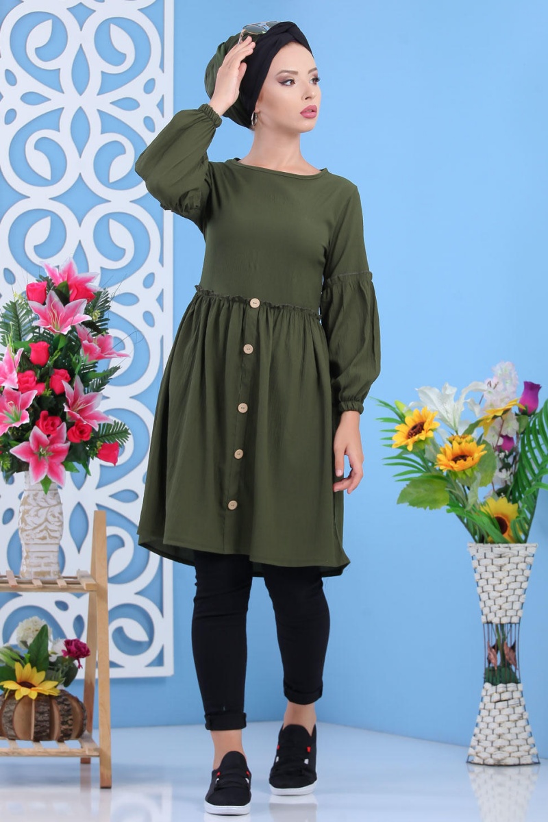 Tunique longue, col rond, manches bouffantes finition élastiques au niveau des poignets, taille cintrée et élastique, tissu effet crêpe. Ce modèle simple et classique vous conviendra car il s'assemble avec tout type de vêtements, les boutons d'ornement ajouteront un plus.