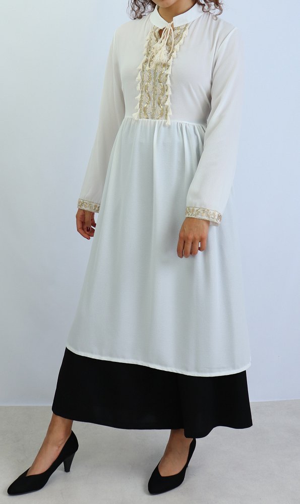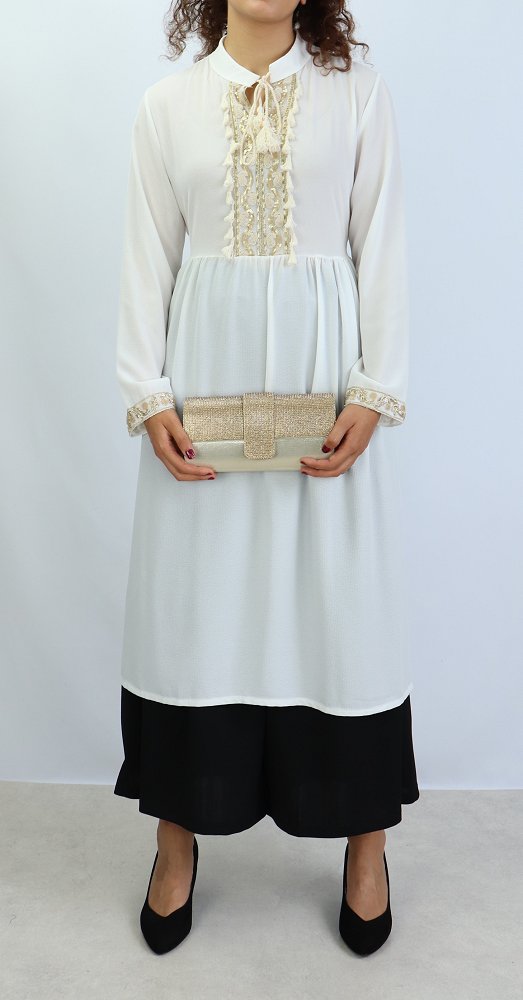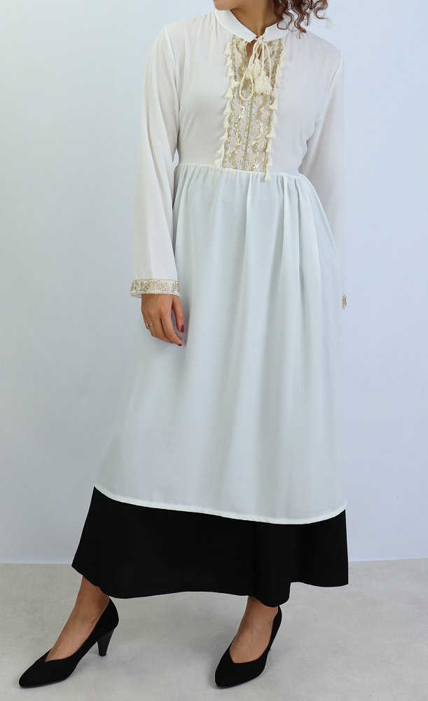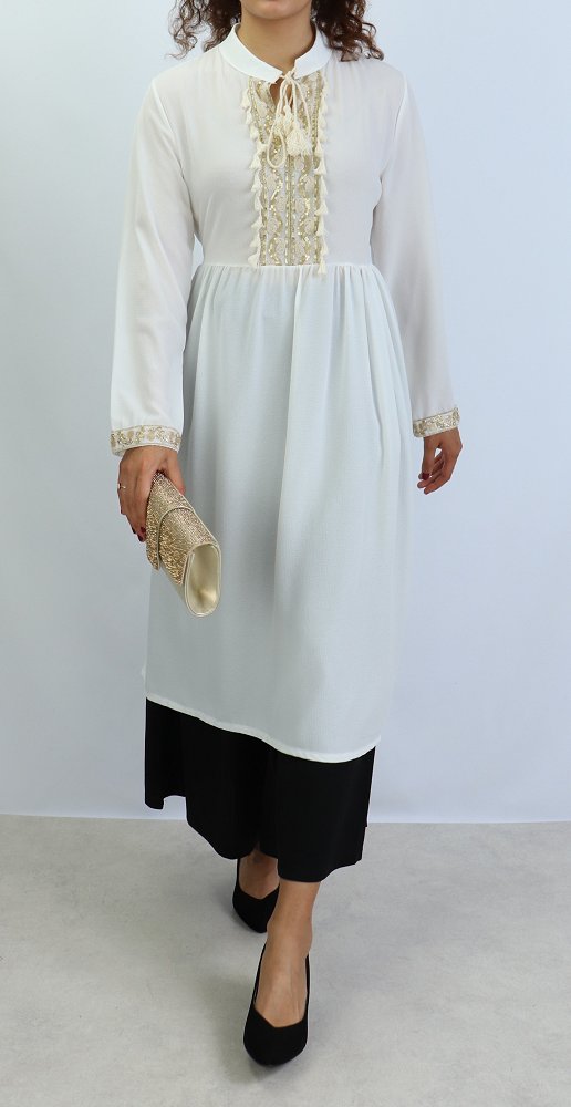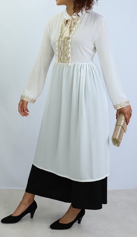 Tunique longue decoree de strass broderie et pompons - Couleur Blanc