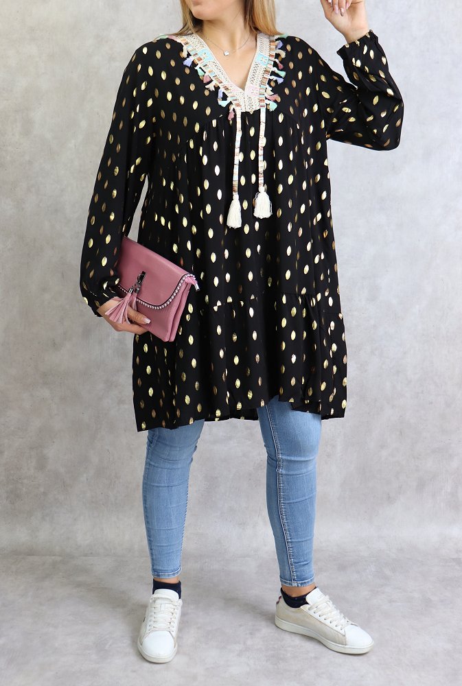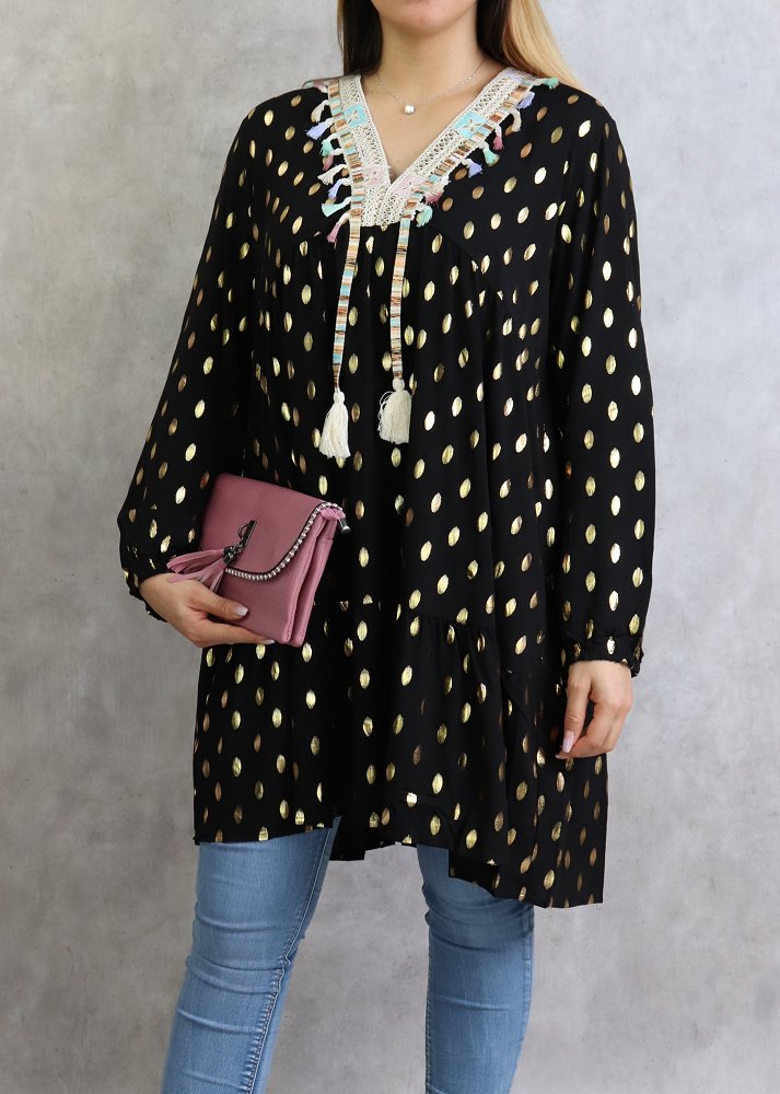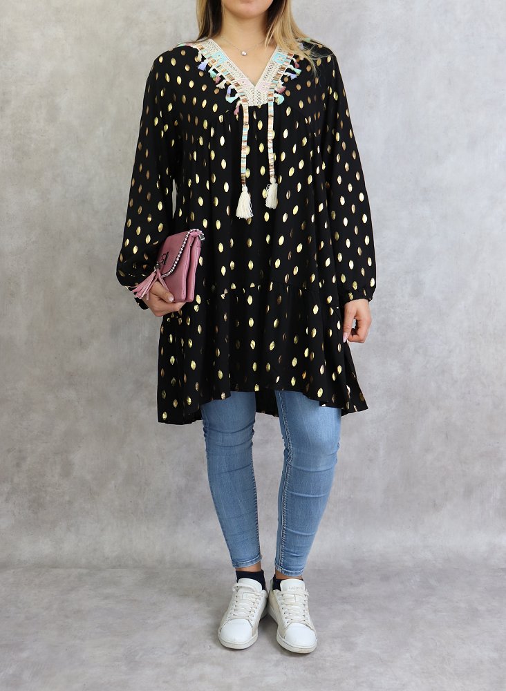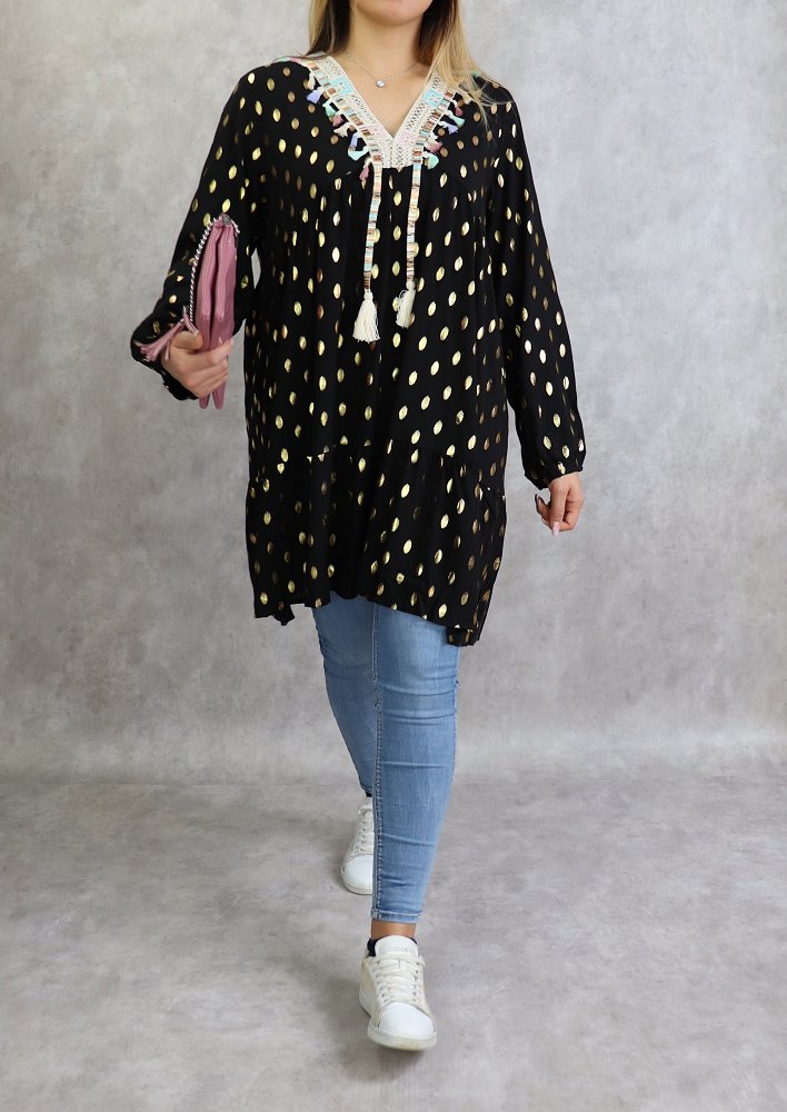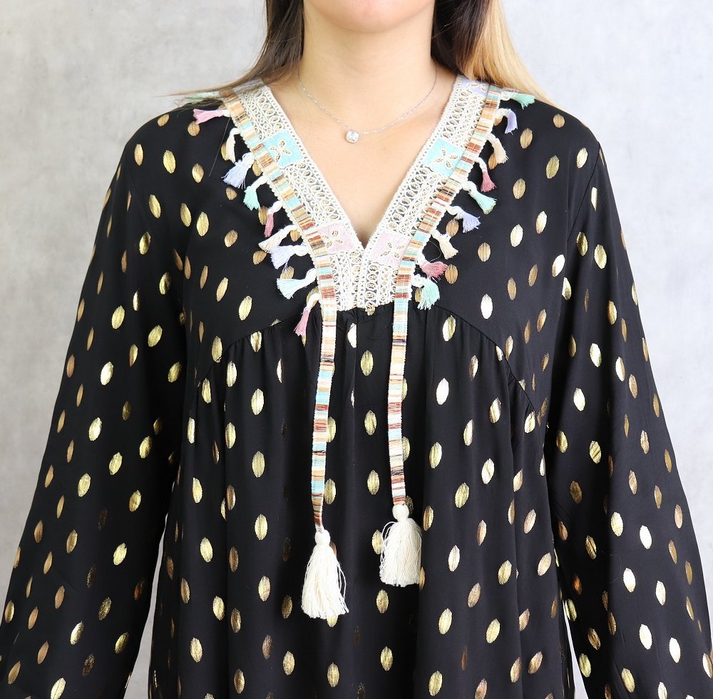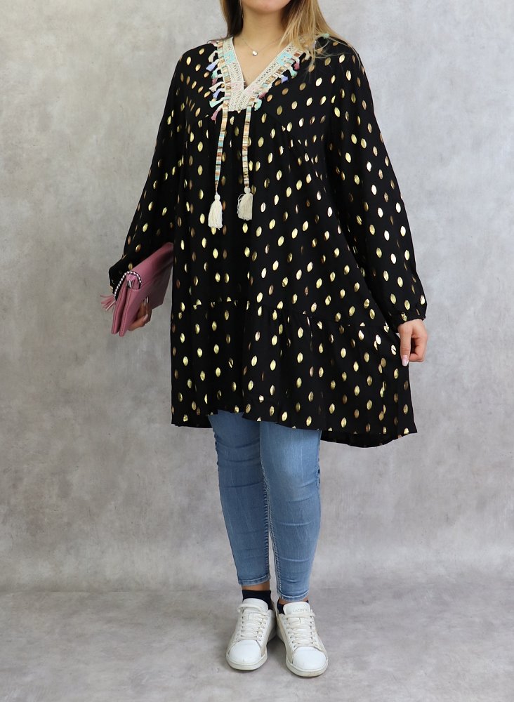 Tunique longue et ample (Grande taille) de couleur noire avec motifs dorés broderies et pompons (100% coton) Vetement & Accessoire