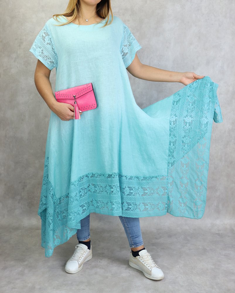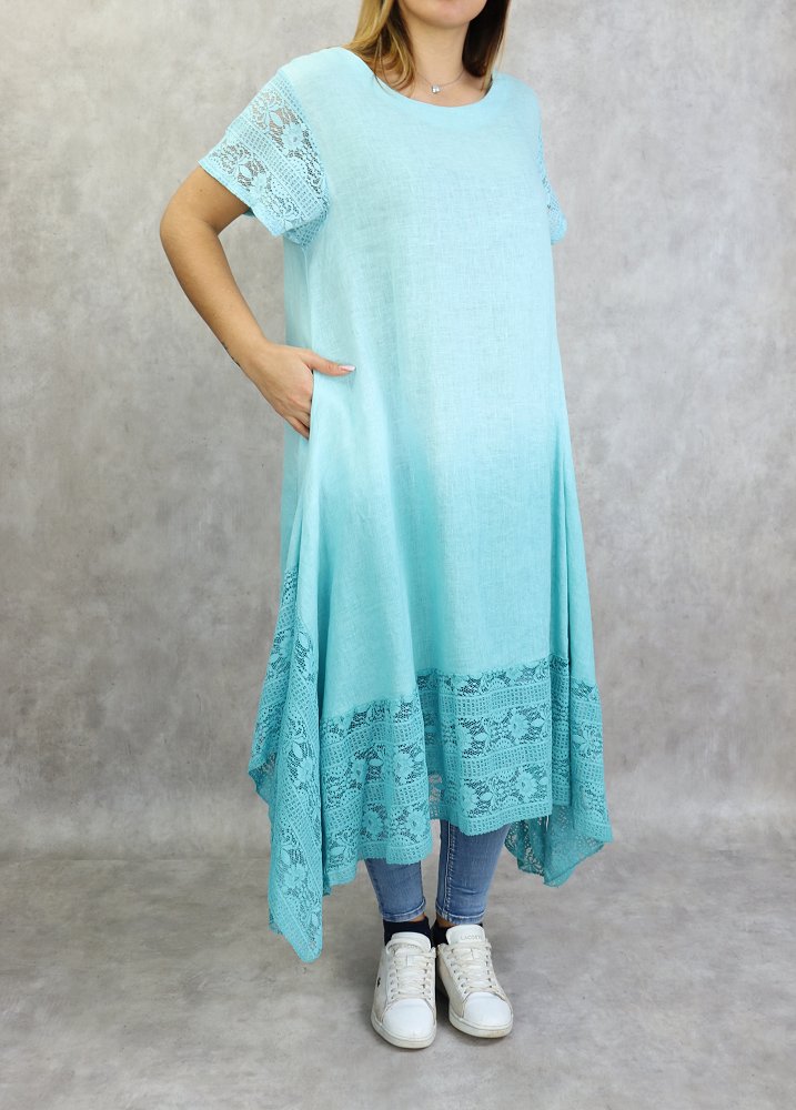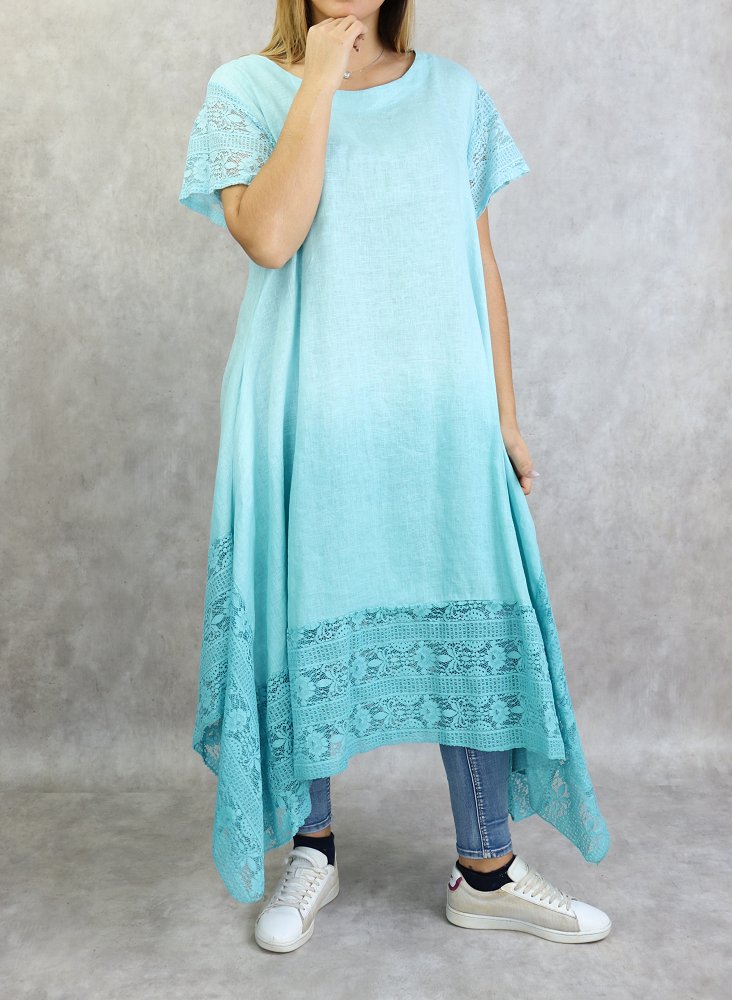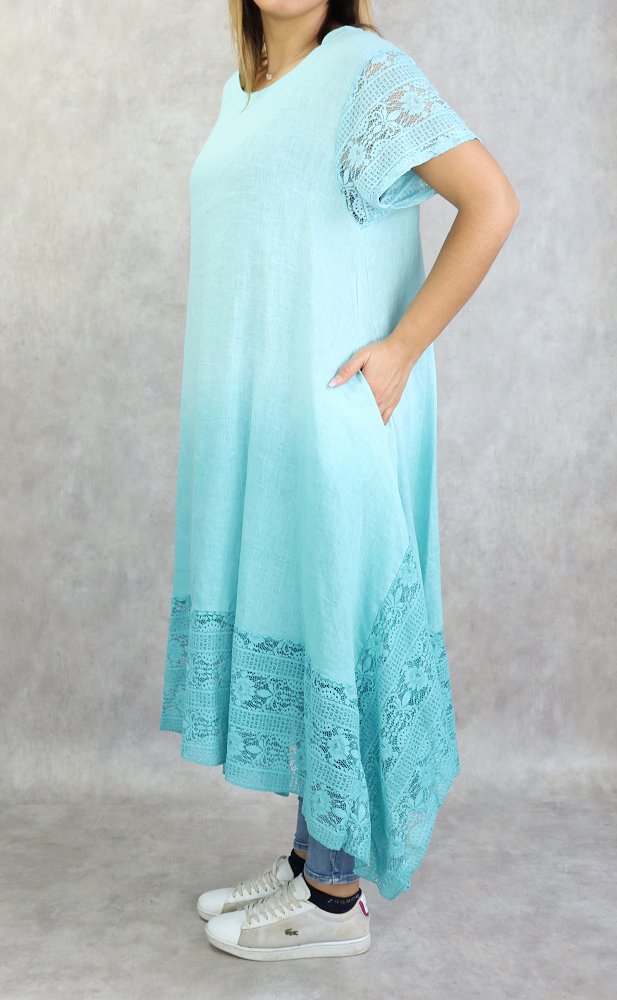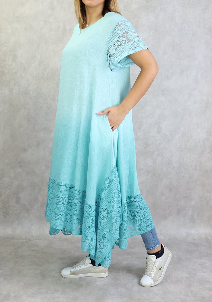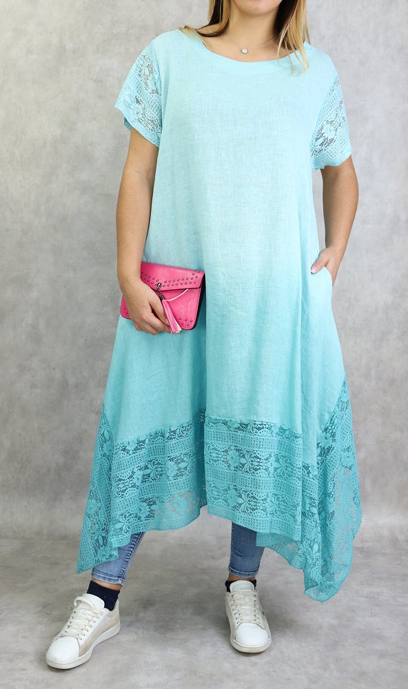 Tunique longue, col dégagé, manches courtes à dentelle ainsi que sur le bas, poches latérales. Coupe évasée, tissu fluide et léger mélange lin /coton agréable en toute saison.