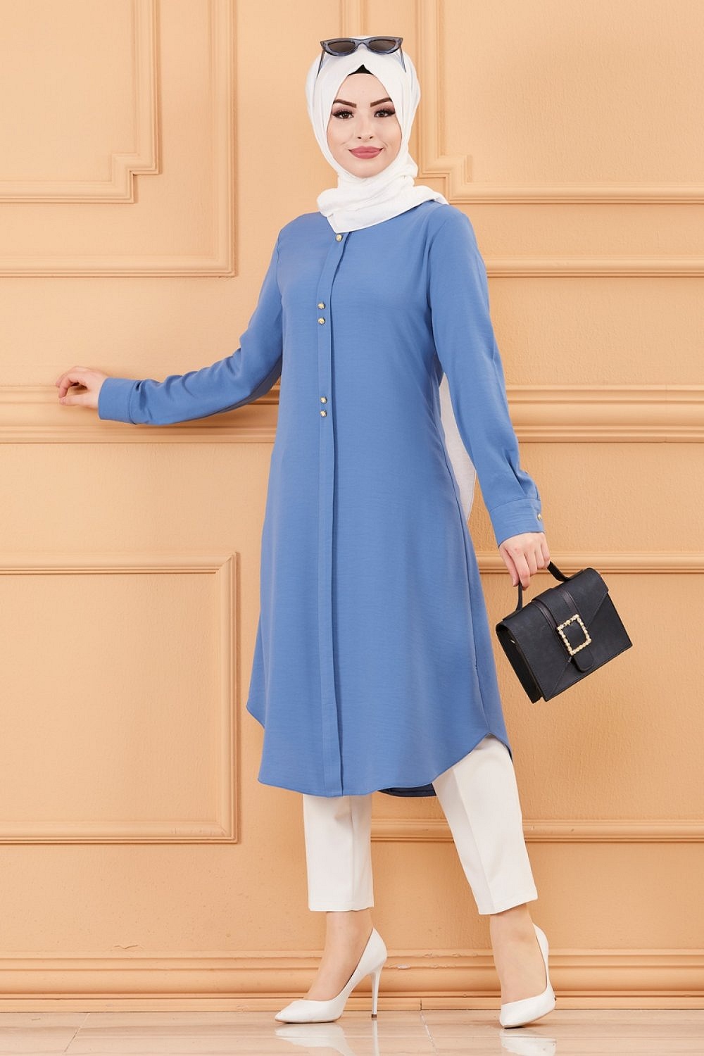 Tunique longue evasee boutonnee pour femme (Vetement style habille pour hijab) - Couleur bleu indigo