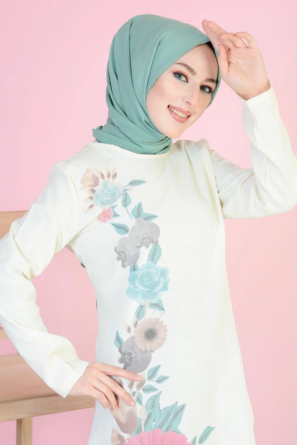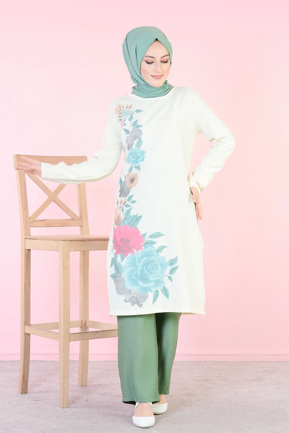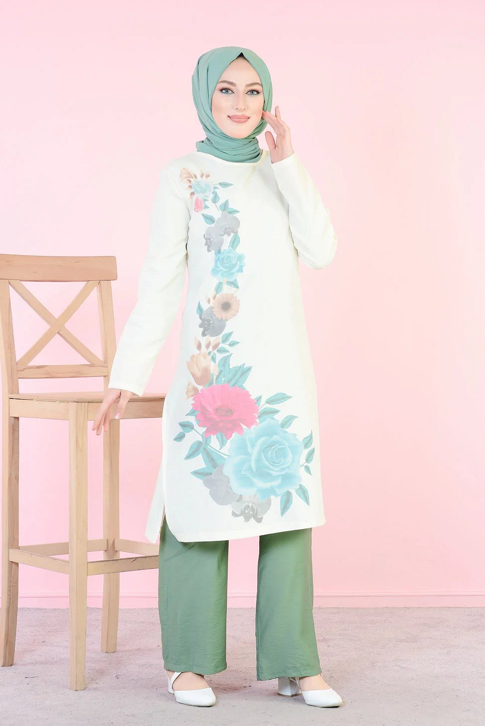 Tunique longue imprimee grandes fleurs rose et menthe (Vetement femme voilee)