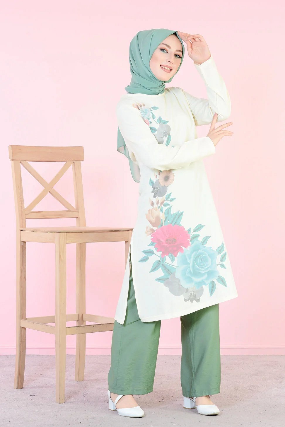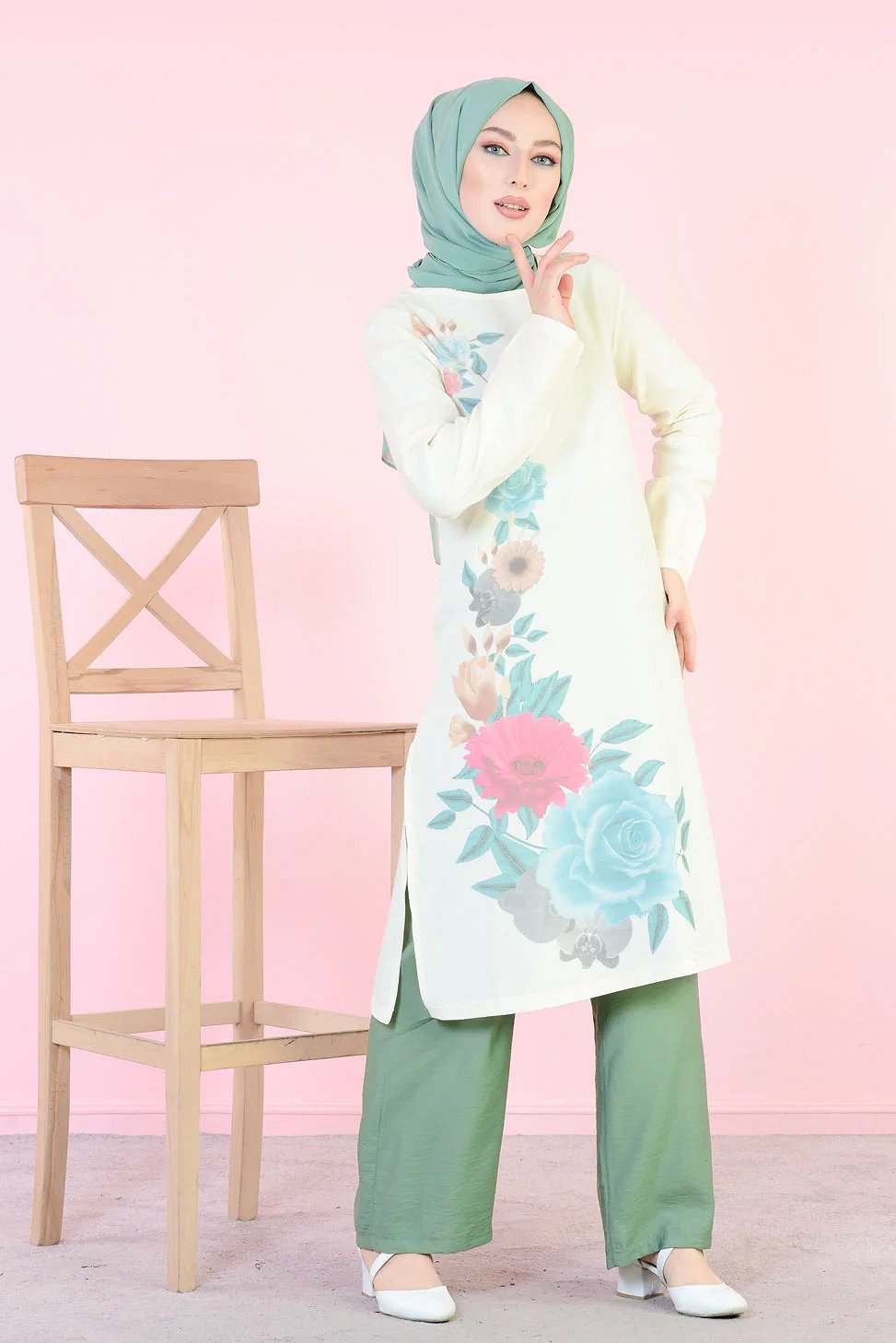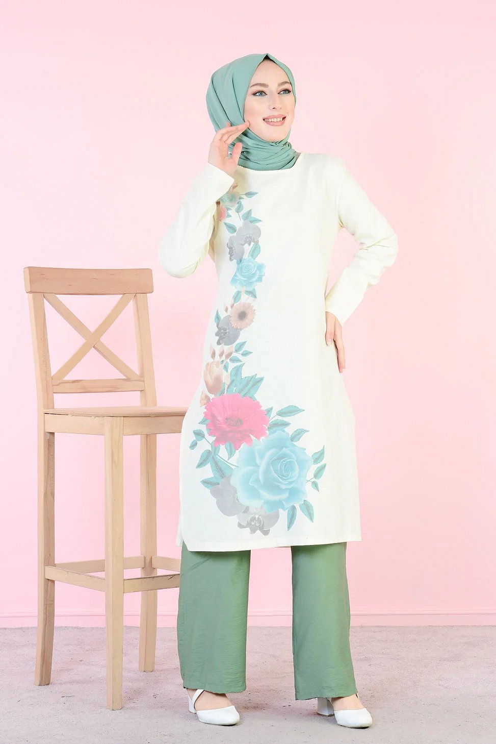 Tunique longue imprimee grandes fleurs rose et menthe (Vetement femme voilee)
