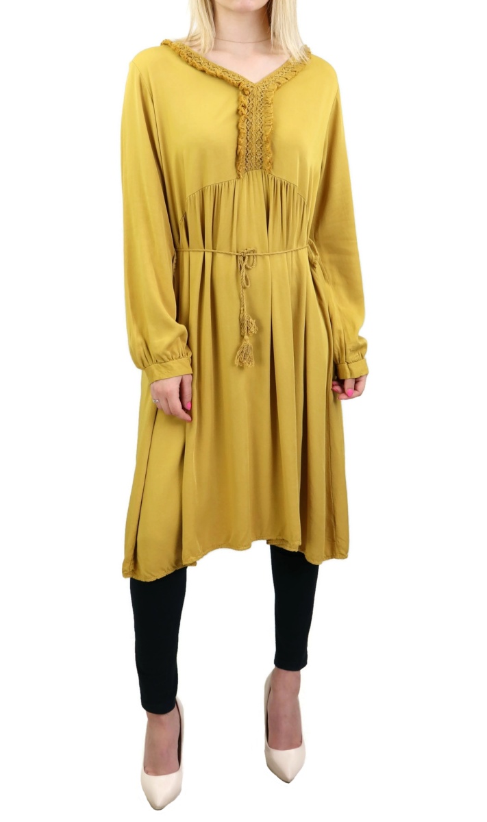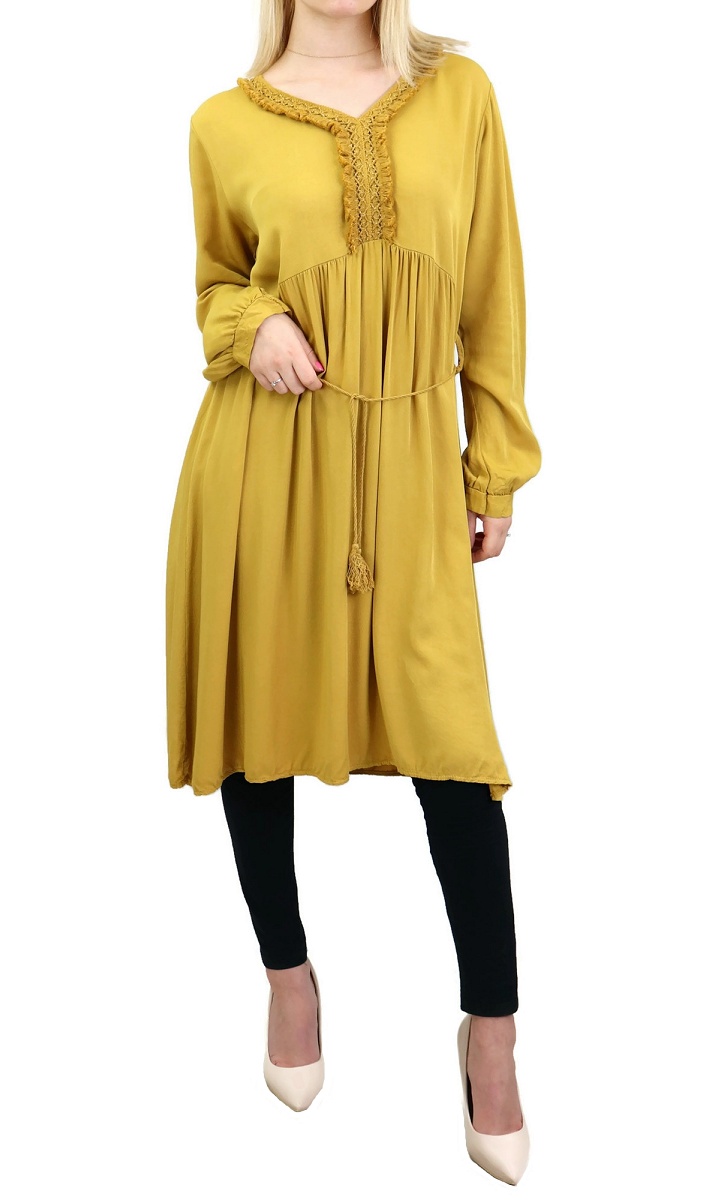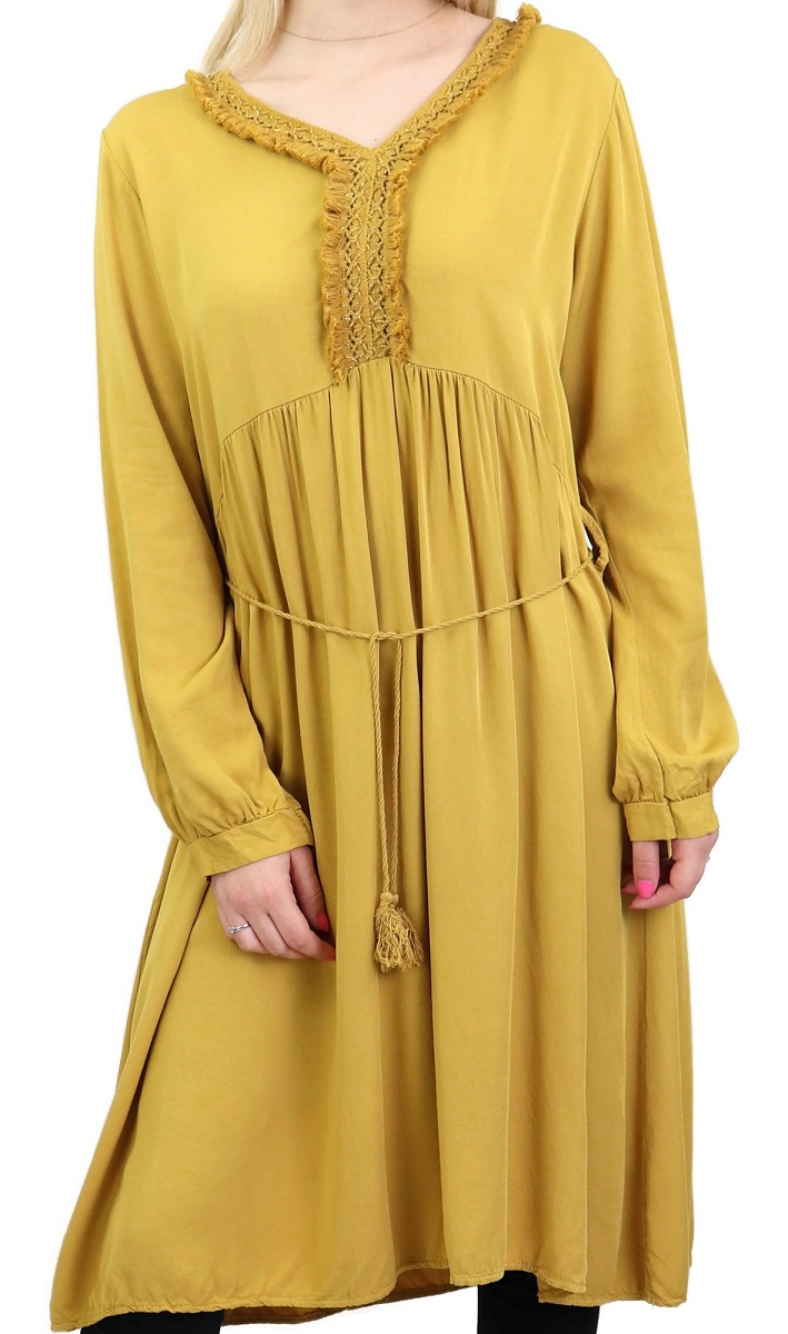 Tunique longue, col brodé ceinture assortie avec passants, tissu doux et agréable, coupe évasée. Ce modèle est parfait pour la mi-saison, il fera son effet avec son style bohème. La ceinture peut s'attacher par devant ou derrière...