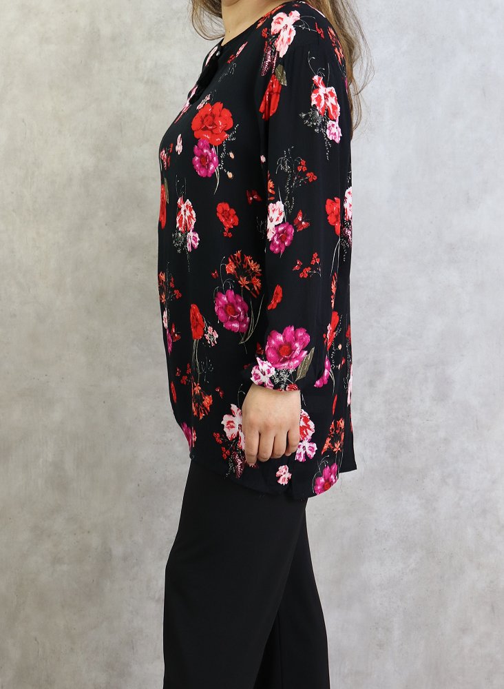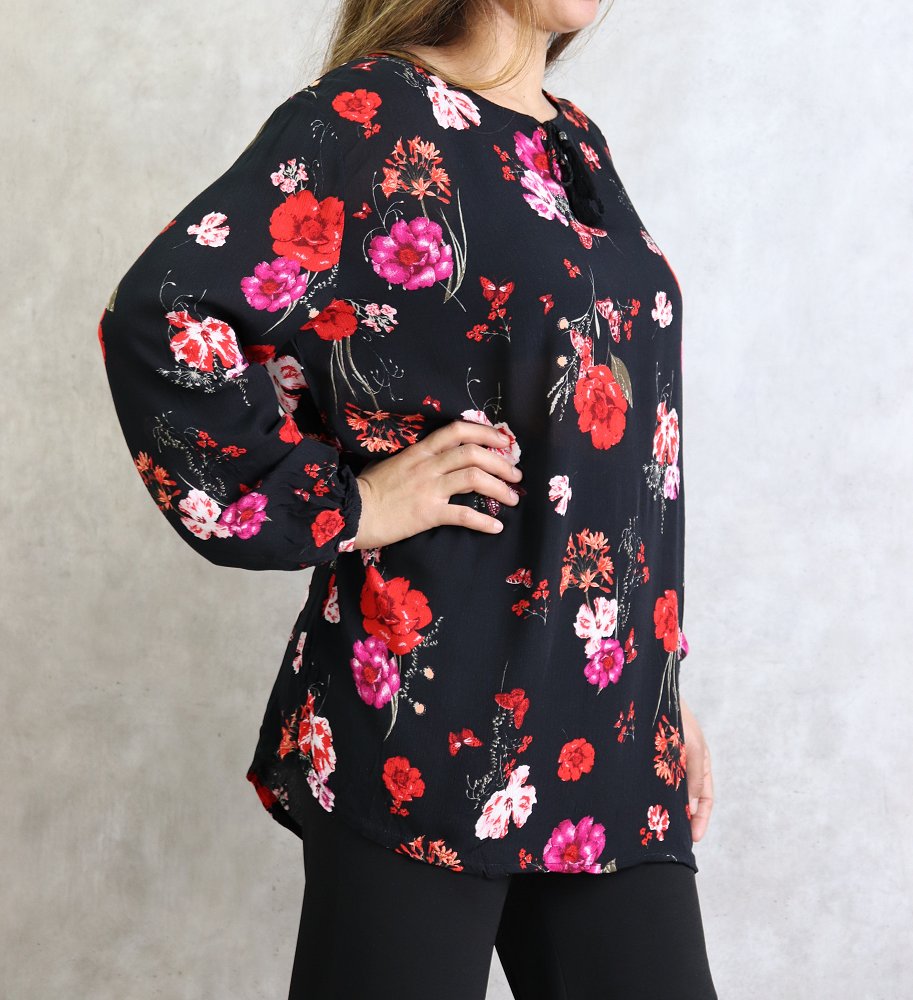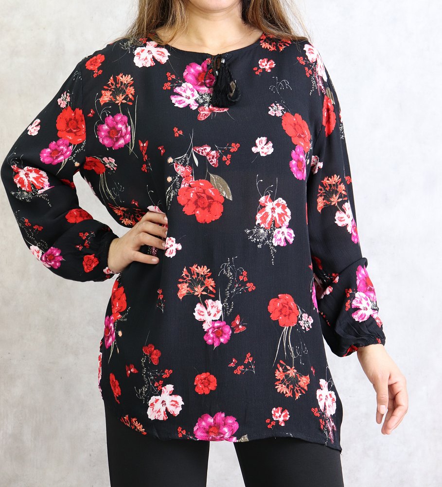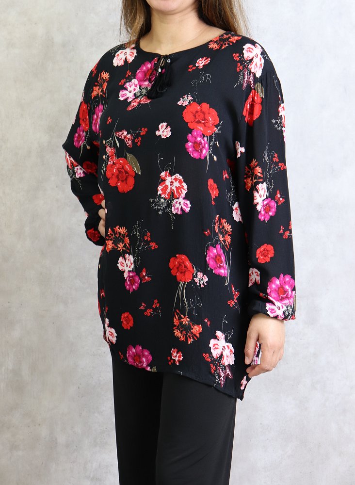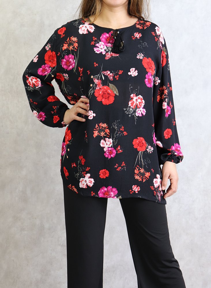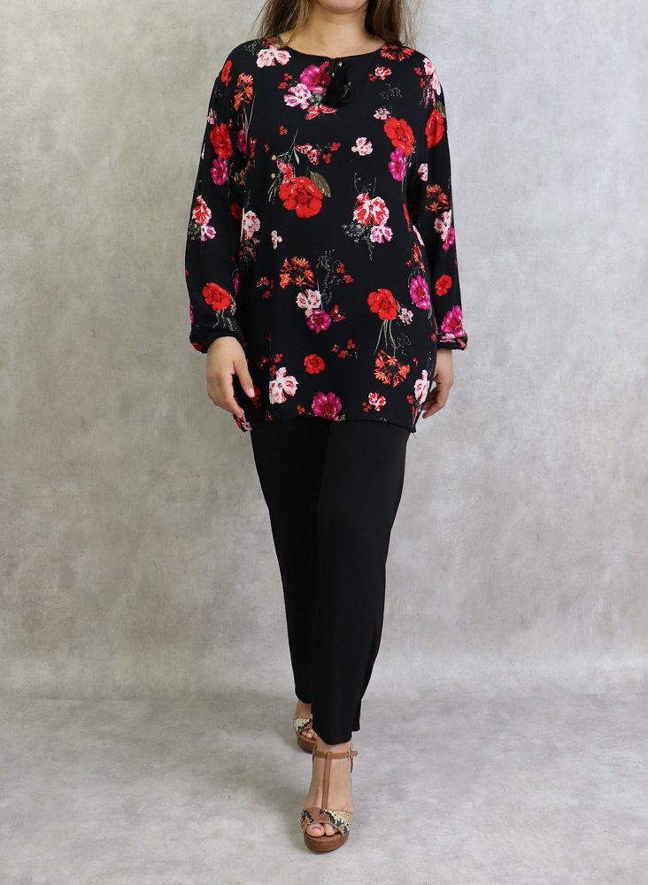 Tunique noire a fleurs roses et rouges (Grandes tailles disponibles pour femmes)