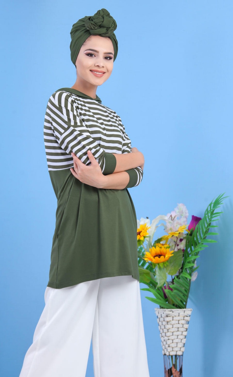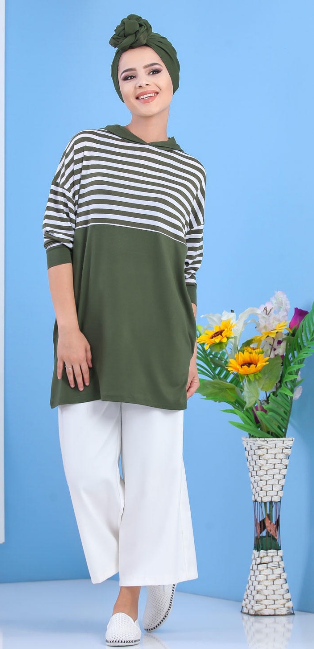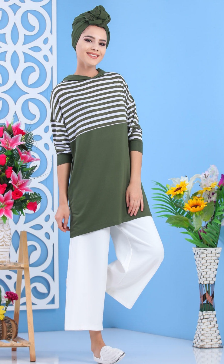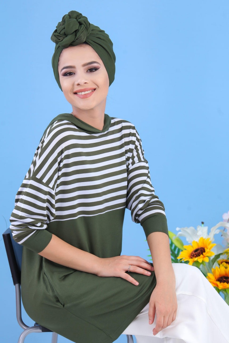 Tunique rayée à capuche de type sportswear pour femme - Couleur vert kaki Vetement & Accessoire