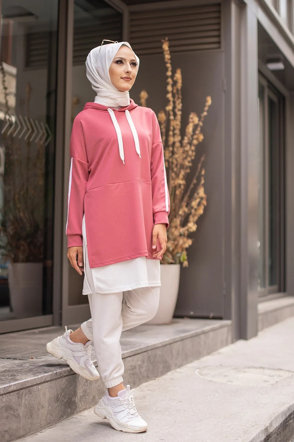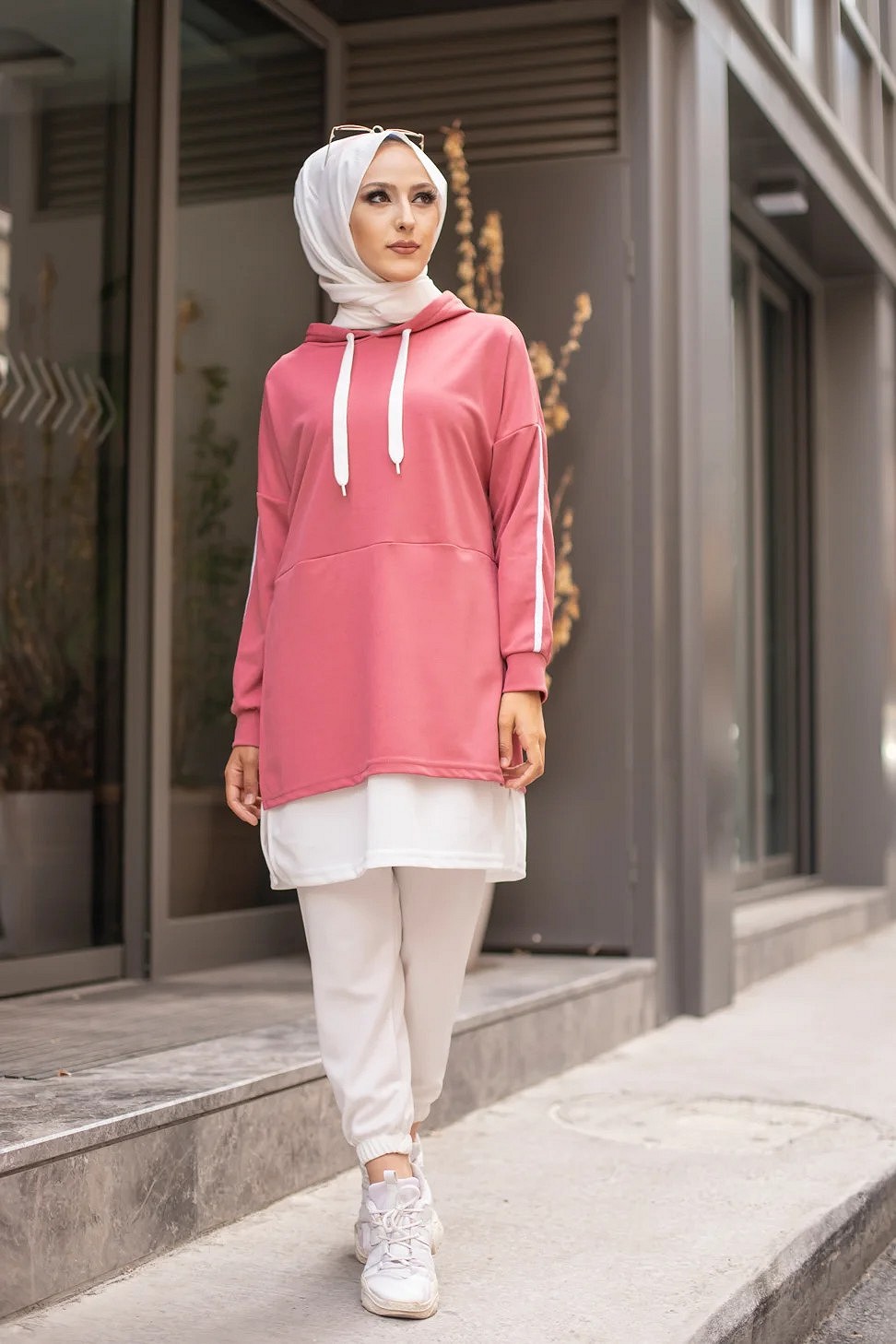 Tunique sportive bicolore pour femme musulmane - Sweat à capuche tendance pas cher - Couleur blanc et rose Vetement & Accessoire