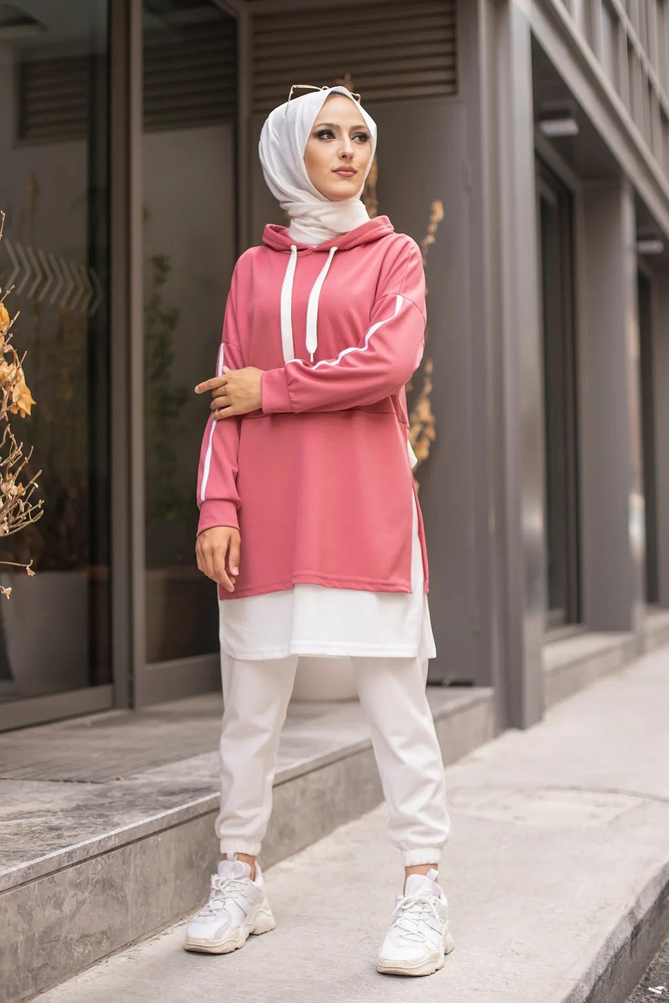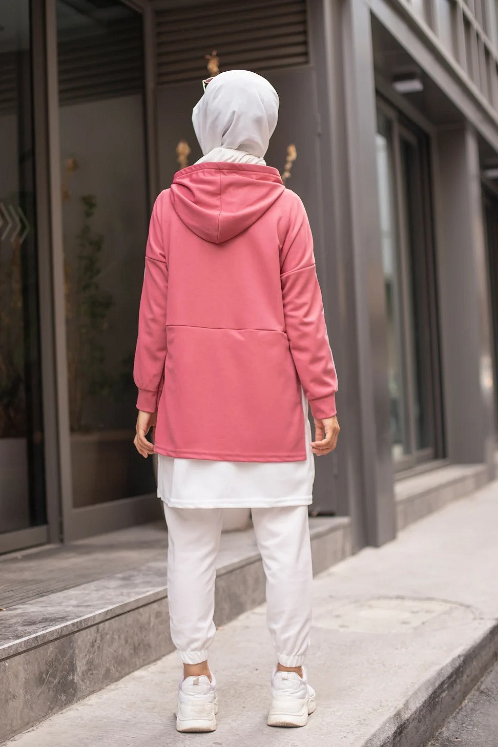 Tunique sportive bicolore pour femme musulmane - Sweat a capuche tendance pas cher - Couleur blanc et rose