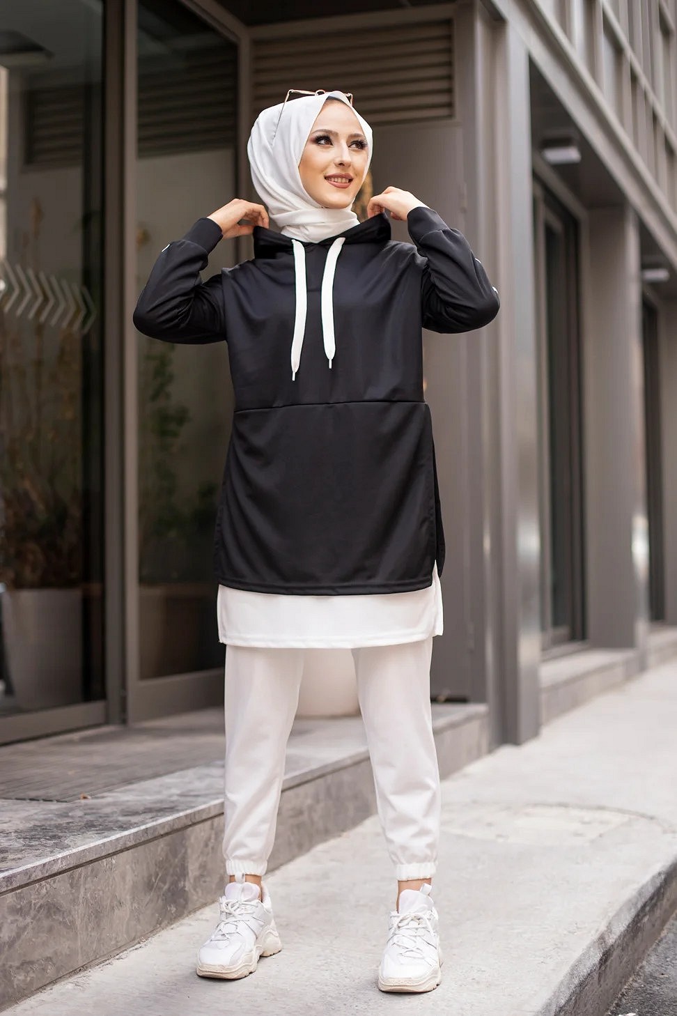 Ensemble bicolore pour femme : Tunique à capuche et pantalon assorti (Tenue décontractée et sport pour hijab) - Couleur noir et gris - REF. 36358 (26.00 €)
