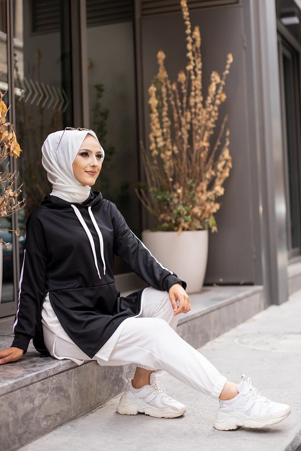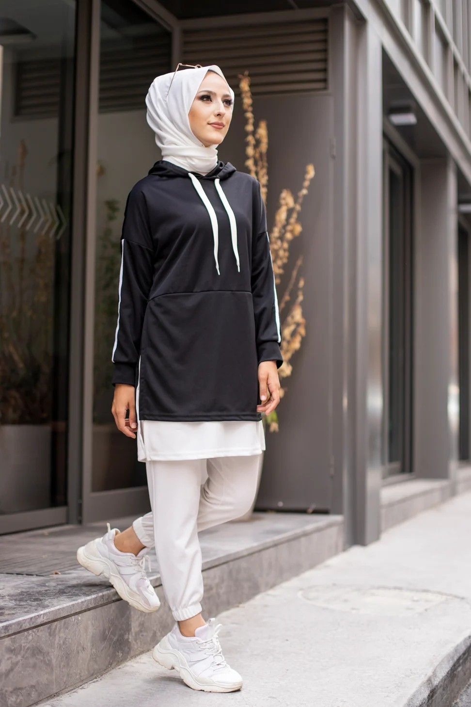 Tunique sportive bicolore pour femme musulmane (Vetement hijab moderne pas cher) - Couleur blanc et noir