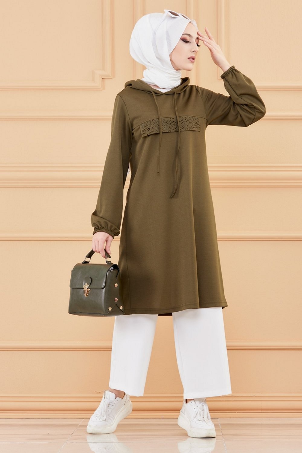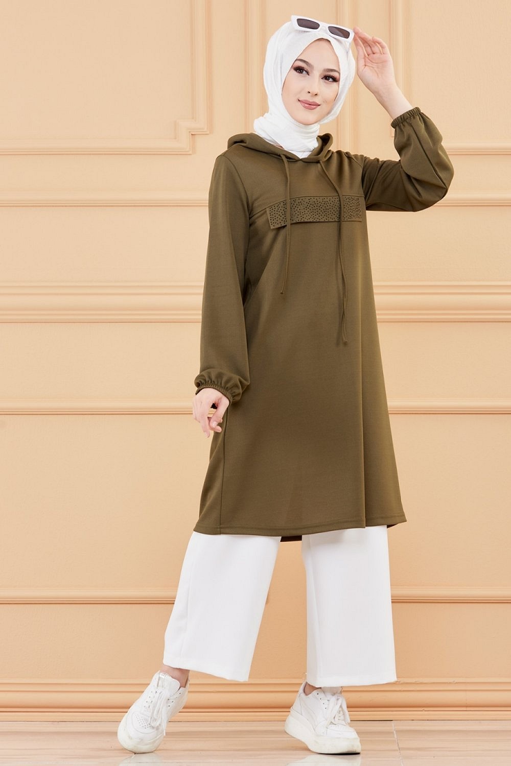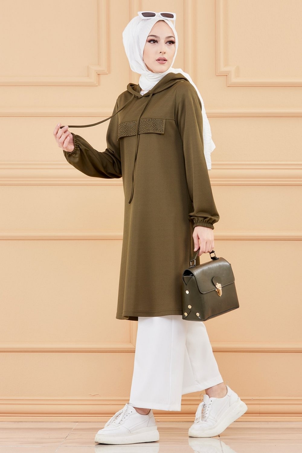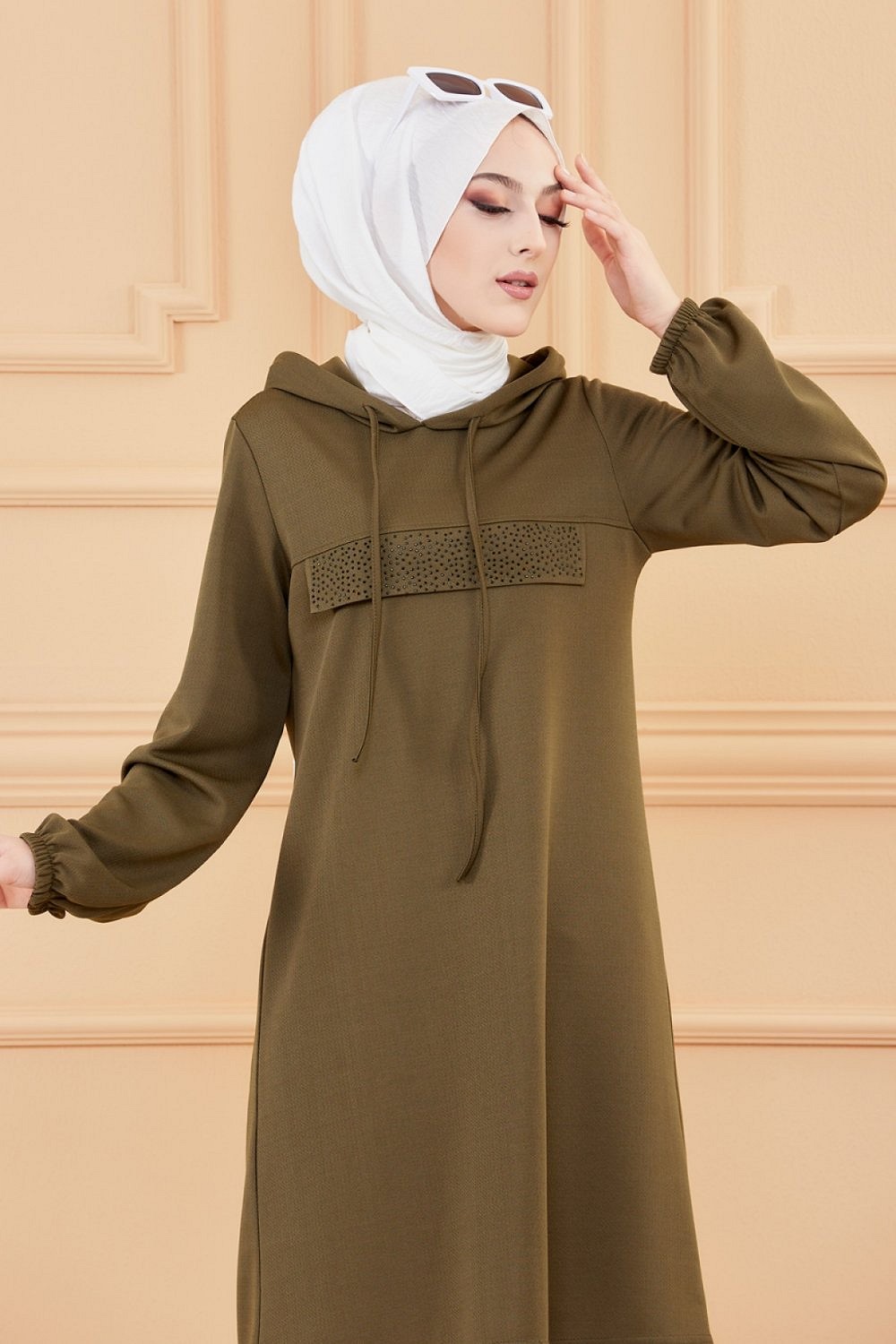 Tunique style decontracte avec strass et capuche (Vetements modernes pour jeunes musulmanes) - Couleur kaki
