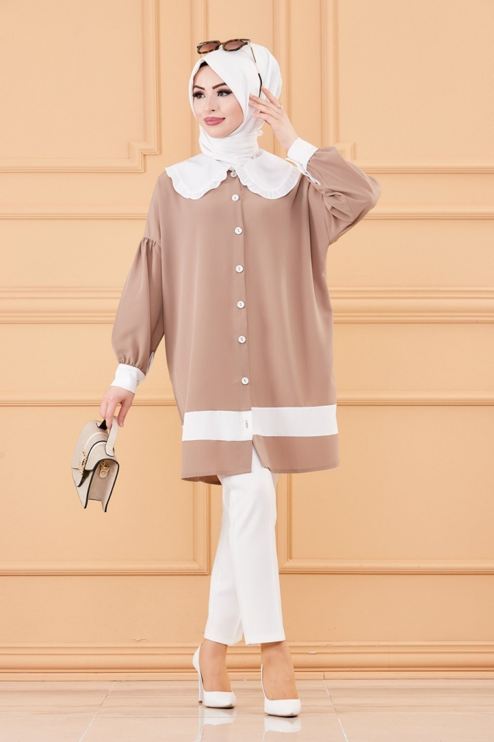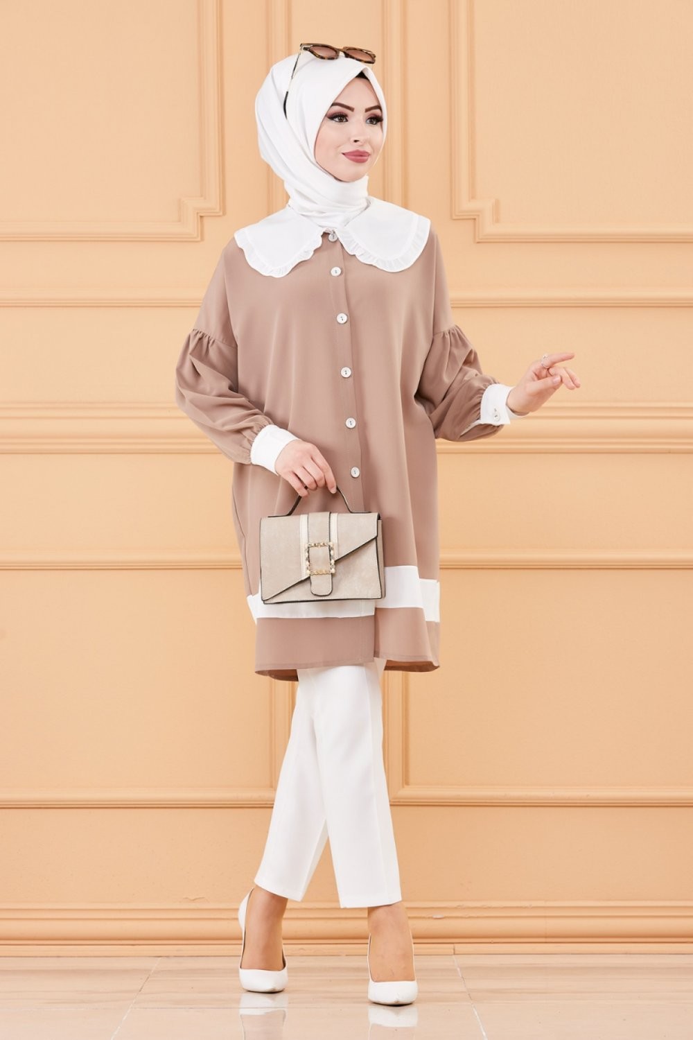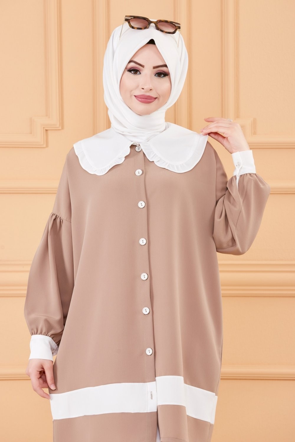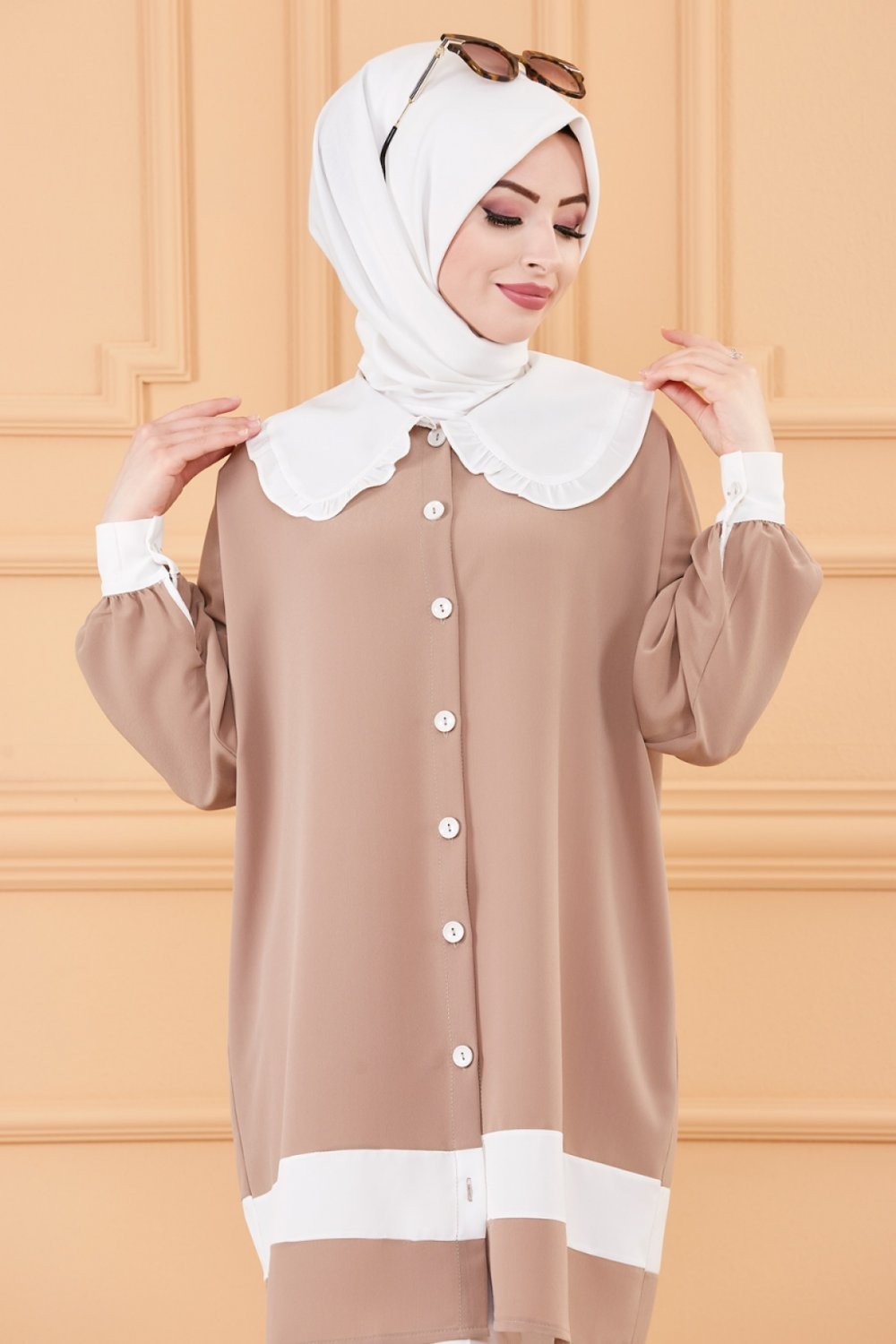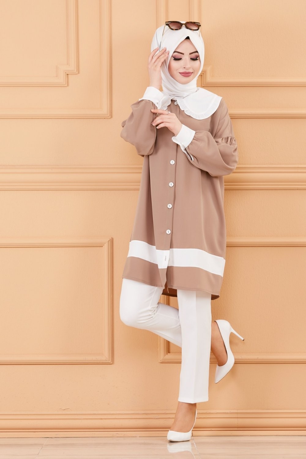 Tunique style habillé (Vêtement chic pour femme voilée) - Couleur taupe et blanc Vetement & Accessoire