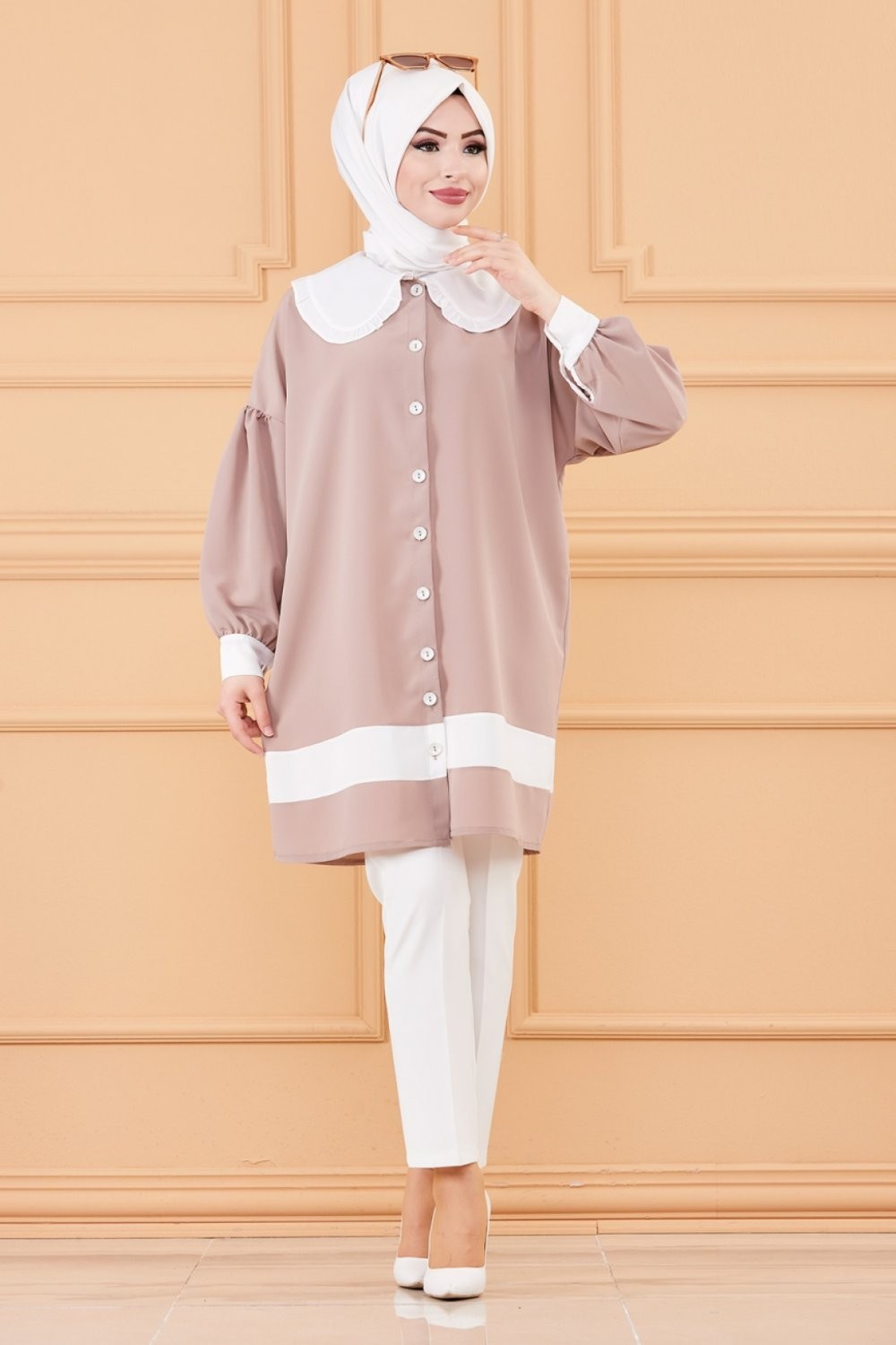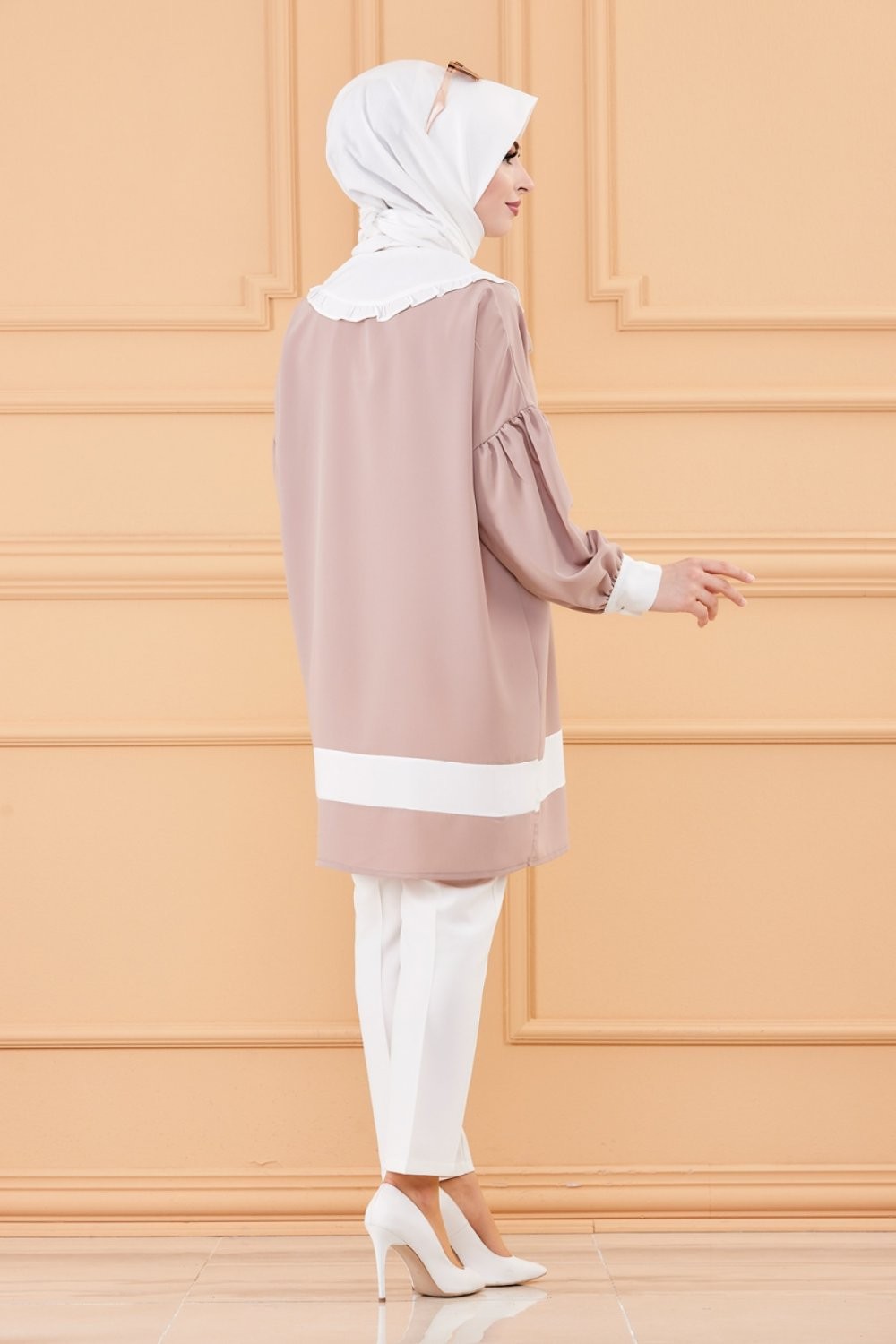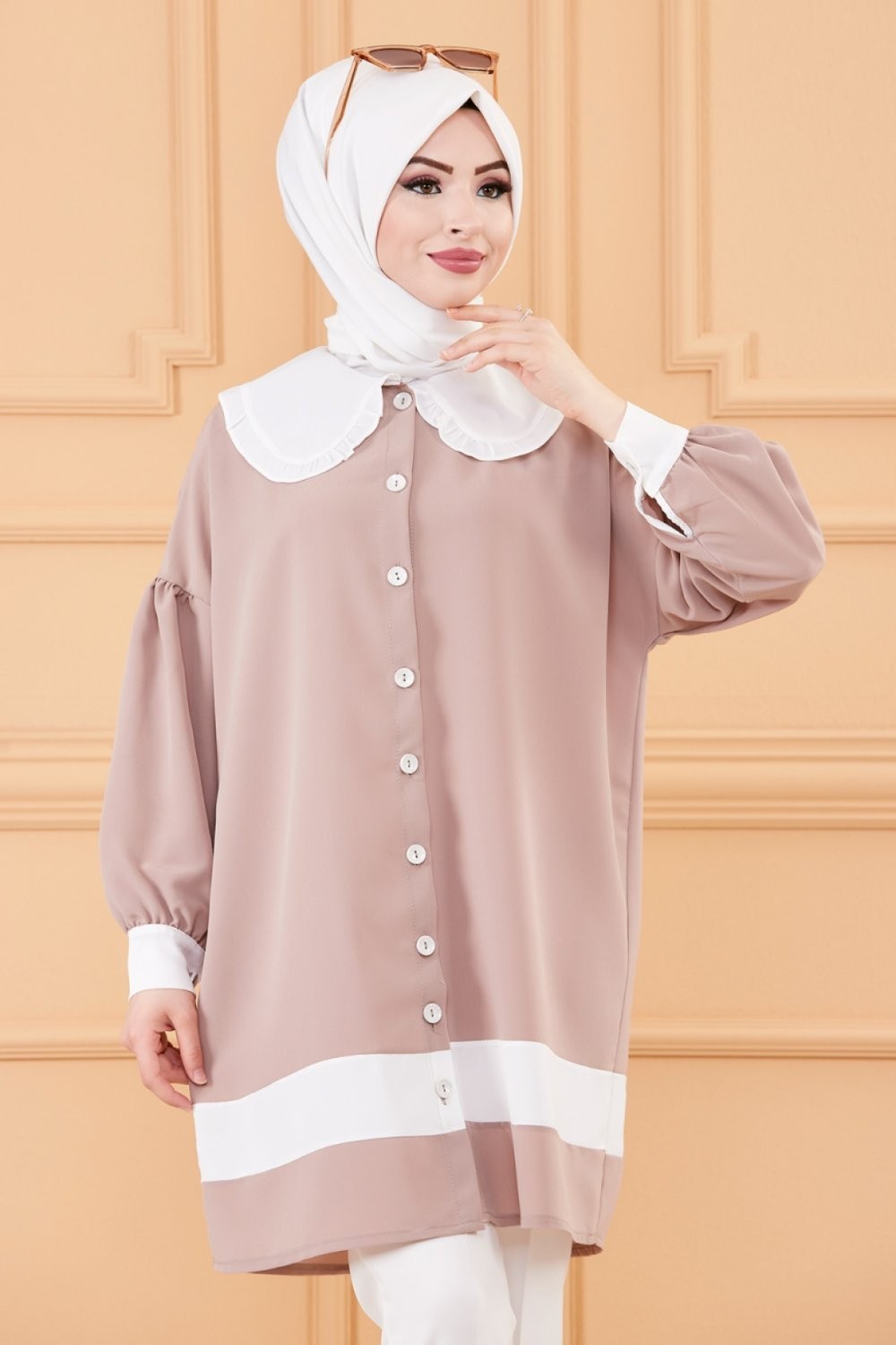 Tunique style habillé pour femme (Vêtement chic pour hijab) - Couleur beige et blanc Vetement & Accessoire