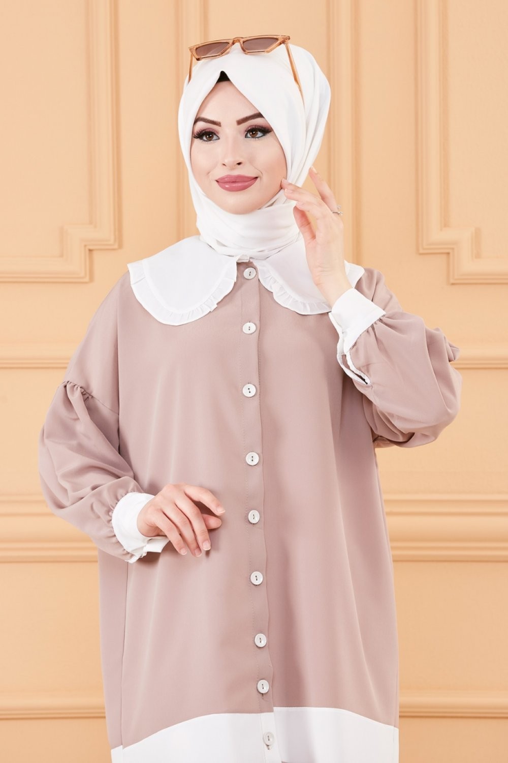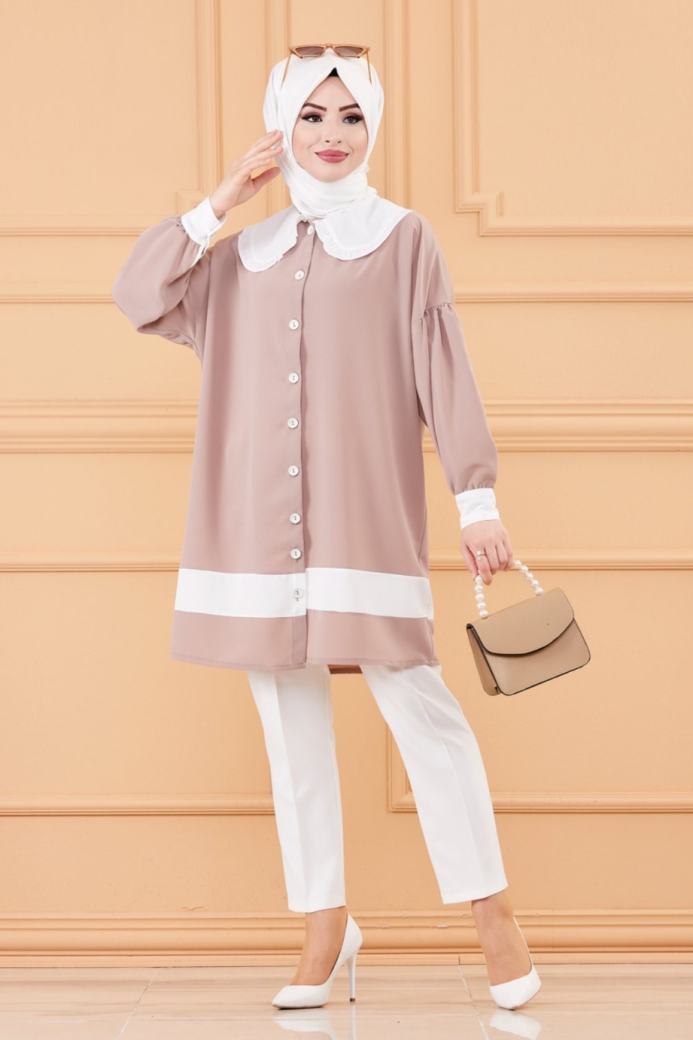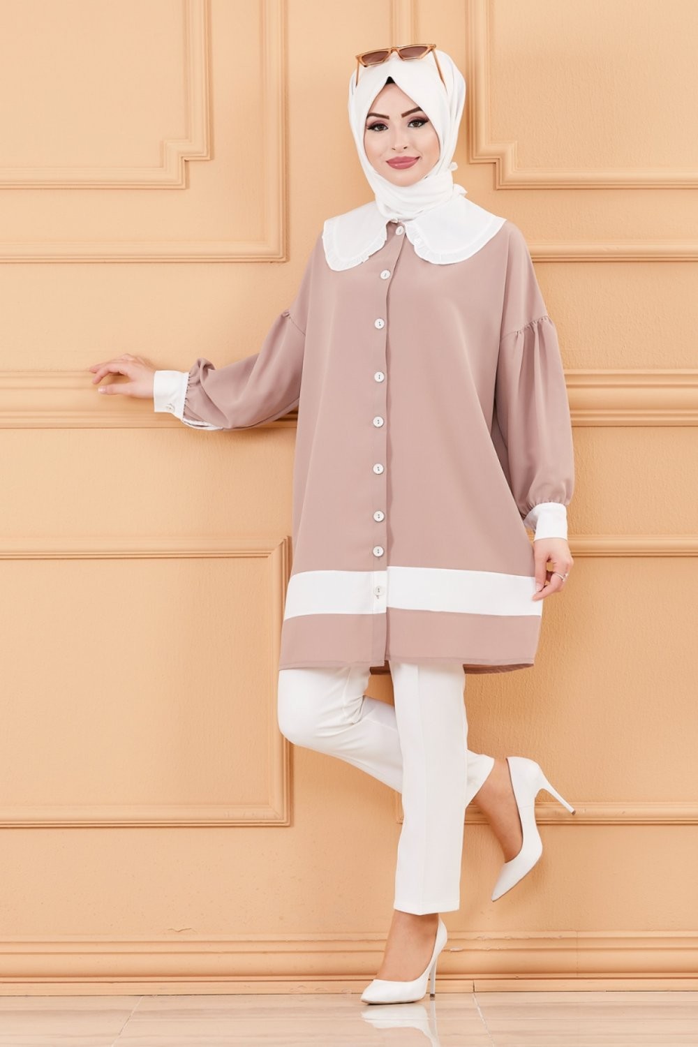 Tunique style habillé pour femme (Vêtement chic pour hijab) - Couleur beige et blanc Vetement & Accessoire