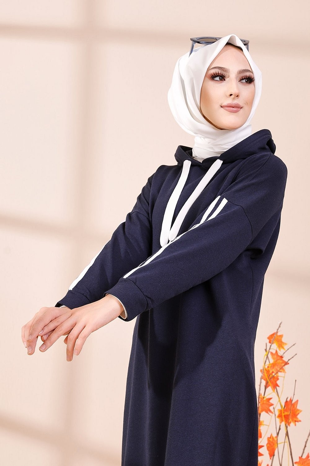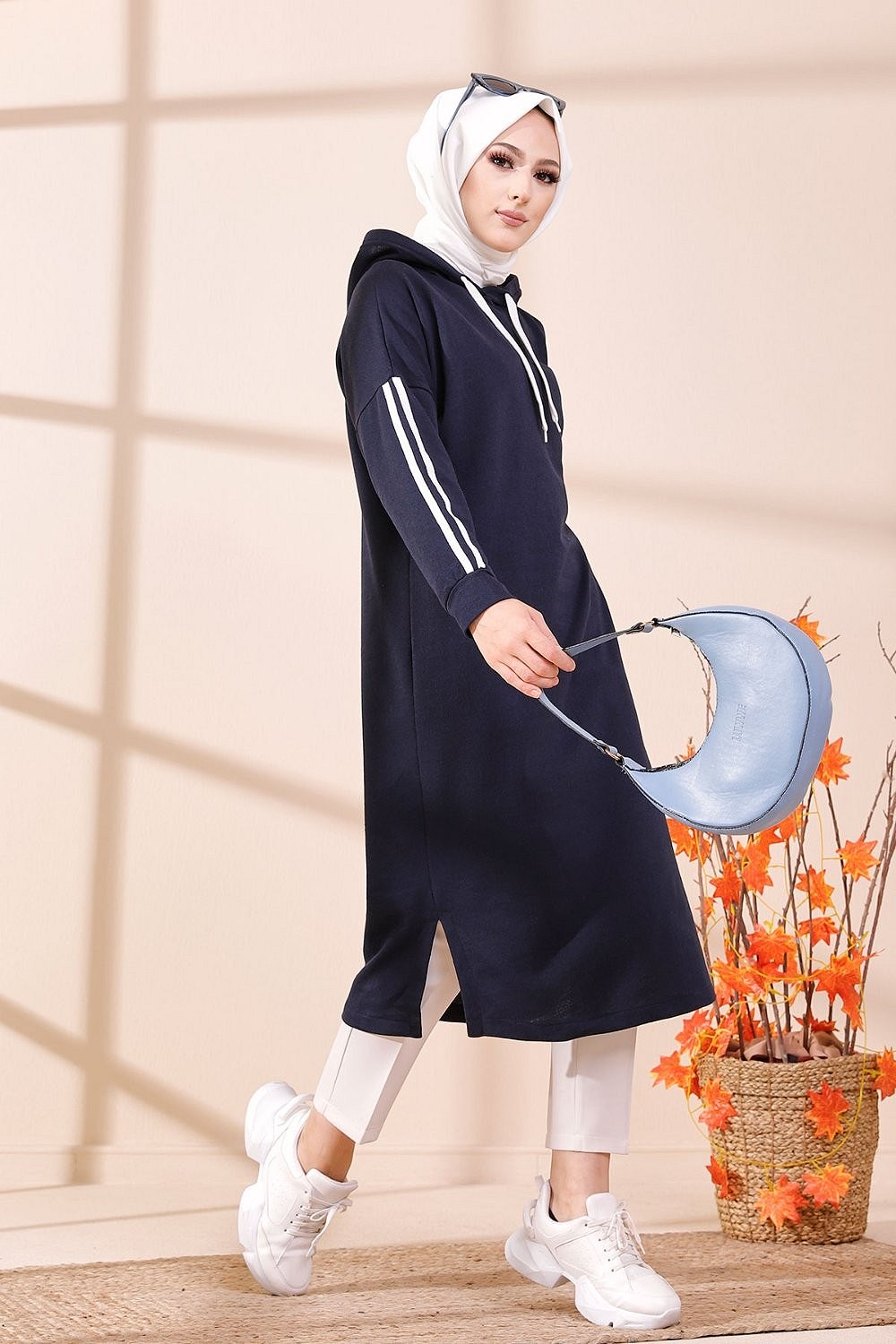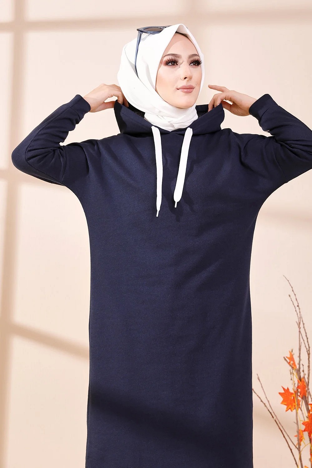 Tunique sweat long avec capuche pour femme (Vetement hijab moderne et sport) - Couleur bleu marine
