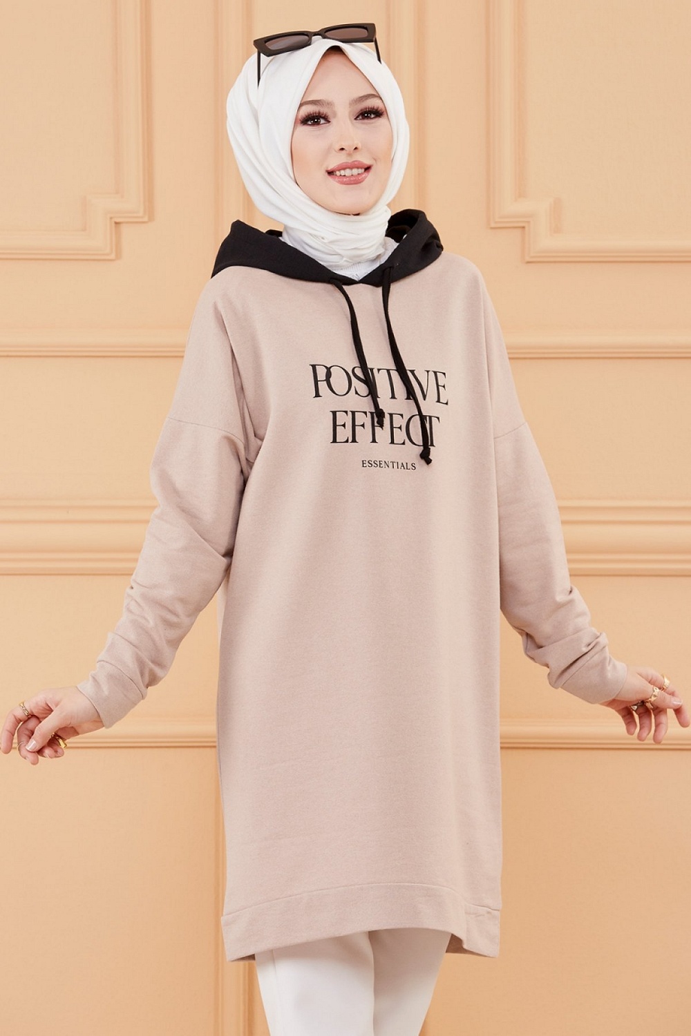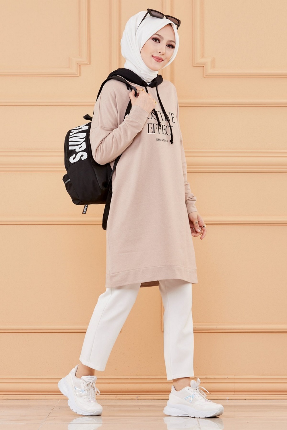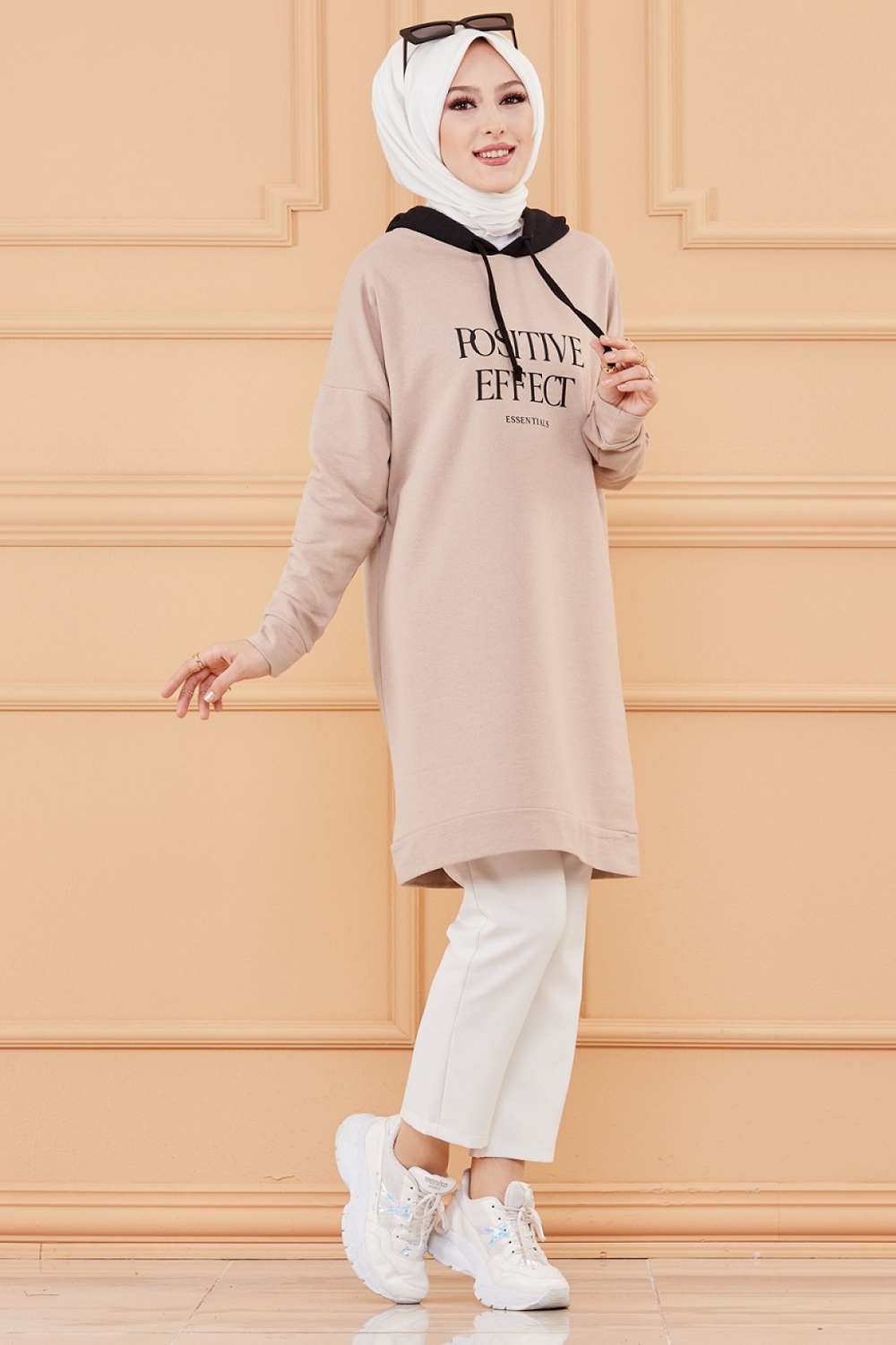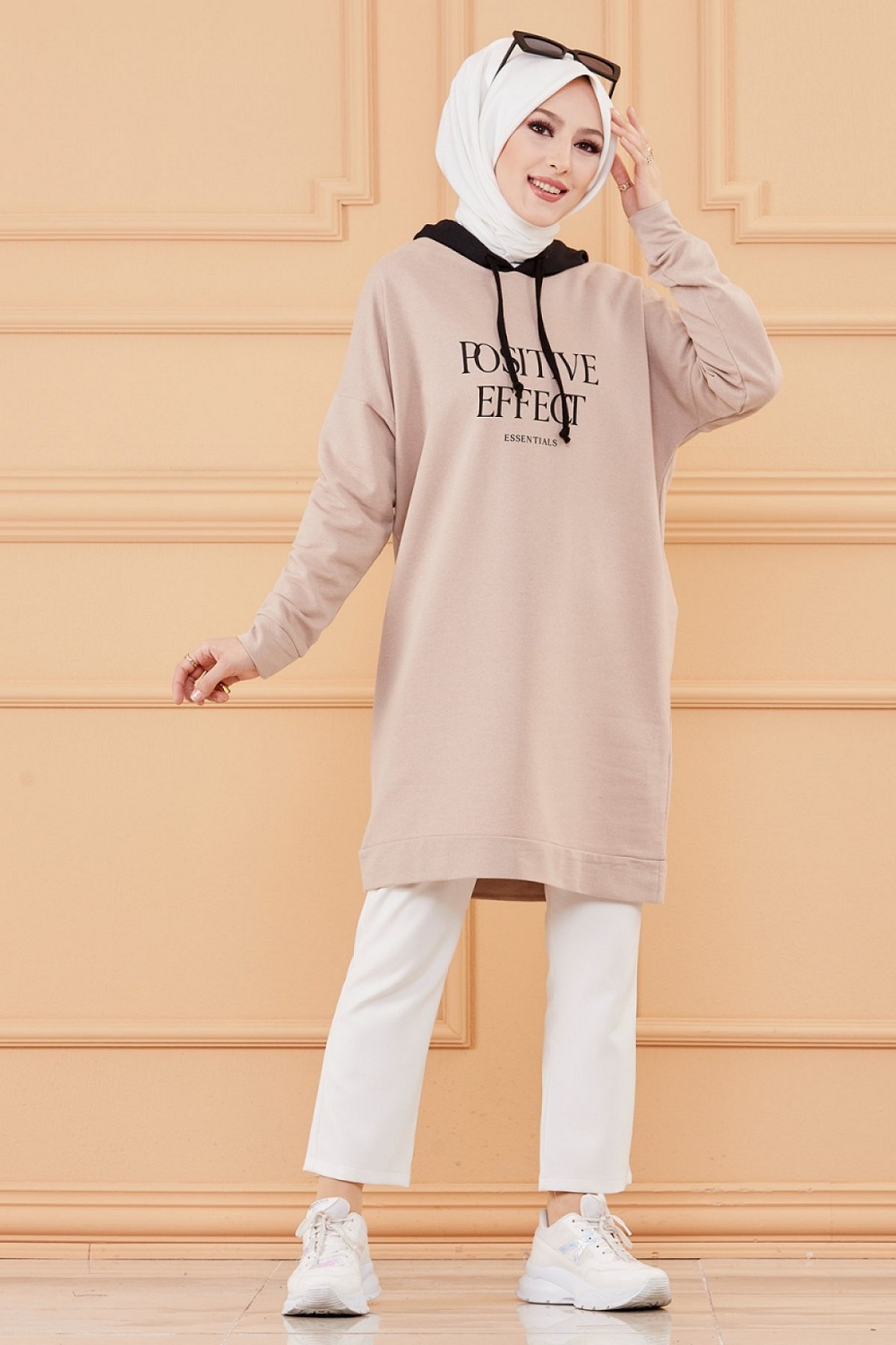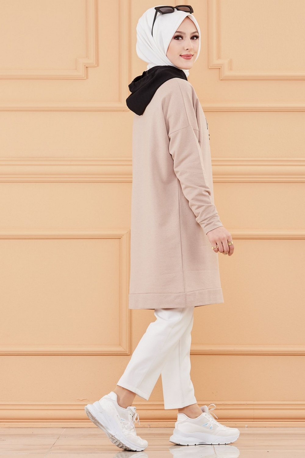 Tunique type sweat-shirt a capuche pur femme (Tenue Hijab decontracte et moderne) - Couleur beige