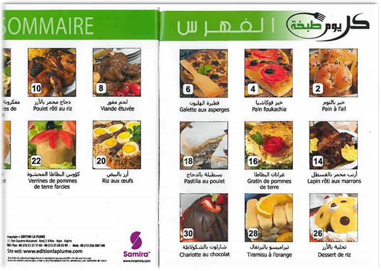 Livre de cuisine avec 15 recettes en photos faciles à préparer. Chaque recette est illustrée par des photos et expliquée en français et en arabe étape par étape.