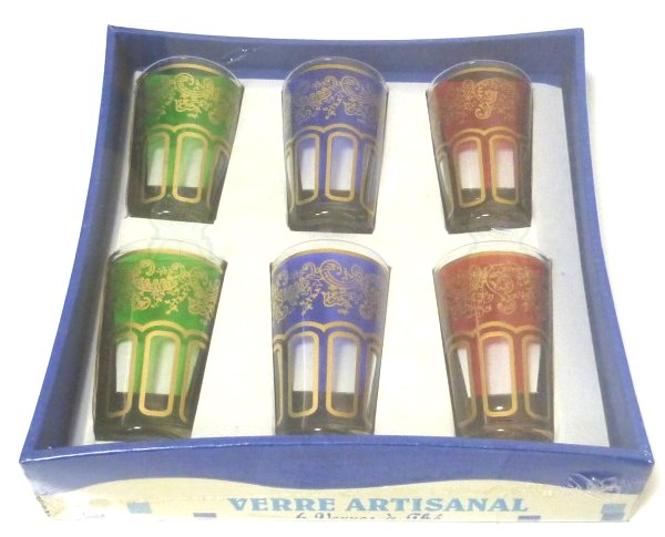 Vos dégustations de thé à la menthe seront désormais un plaisir éternel, avec ce pack de 6 verres à thé, en provenance de Marrakech, avec plusieurs couleurs, et ornés de très beaux motifs traditionnels dorés...