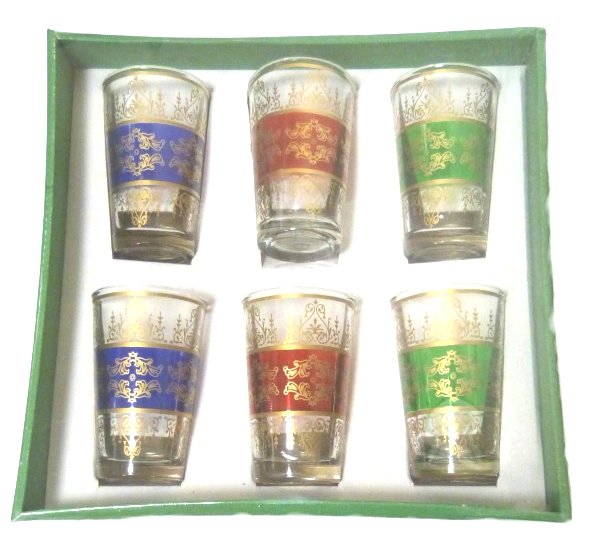 Verres a the marocain CLASSIQUE colores et ornes de motifs traditionnels dores (Pack de 6 verres)