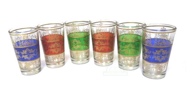 Verres à thé marocain CLASSIQUE colorés et ornés de motifs traditionnels dorés (Pack de 6 verres) - REF. 15941 (20.00 €)