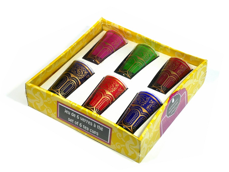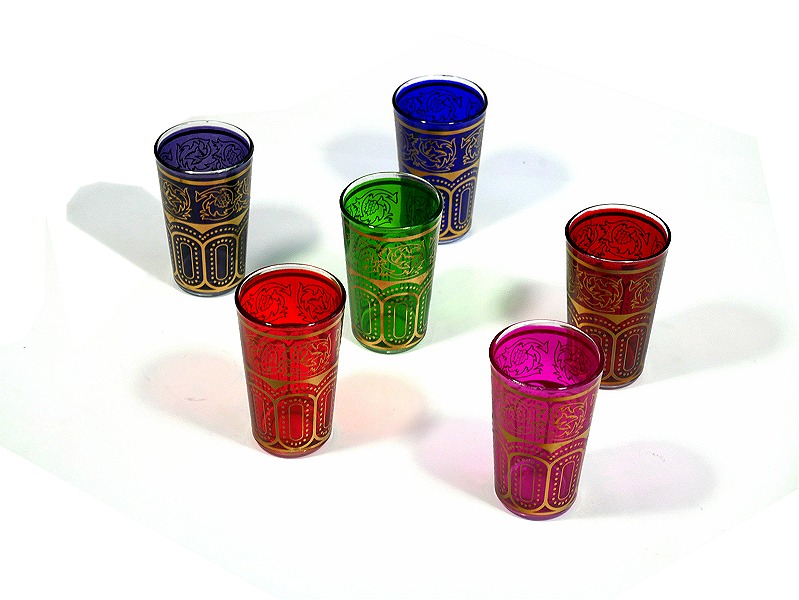 Verres à thé marocain CLASSIQUE colorés et ornés de motifs traditionnels dorés (Pack de 6 verres) - REF. 15941 (20.00 €)