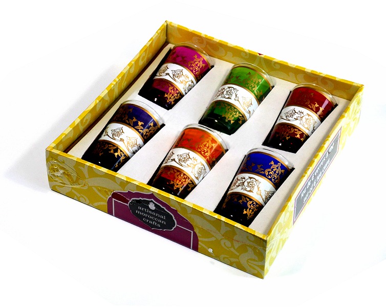 Verres à thé marocain colorés et ornés de motifs traditionnels dorés (Pack de 6 verres) - REF. 29477 (15.00 €)