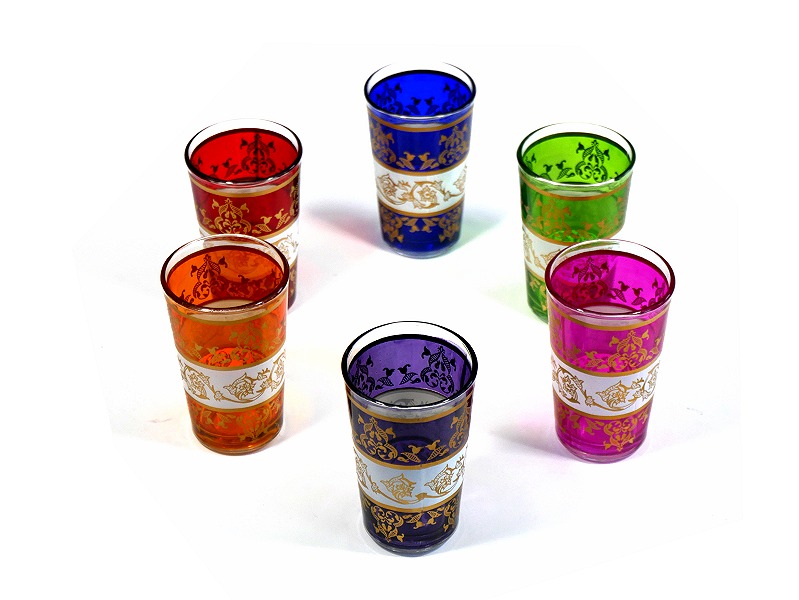 Verres à thé marocain CLASSIQUE colorés et ornés de motifs traditionnels dorés (Pack de 6 verres) - REF. 15941 (20.00 €)