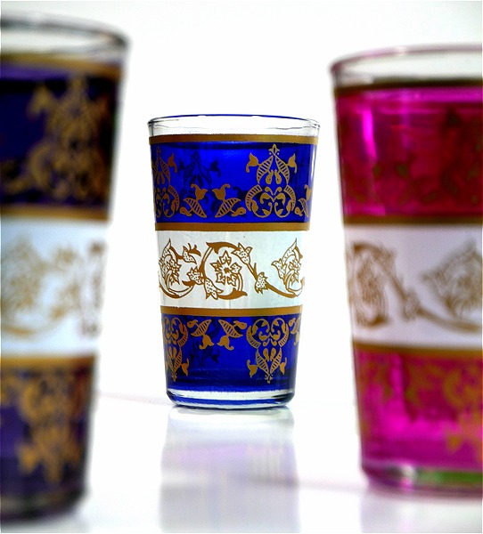 Des verres à thé de fabrication artisanale, colorés et ornés de très beaux motifs traditionnels dorés...