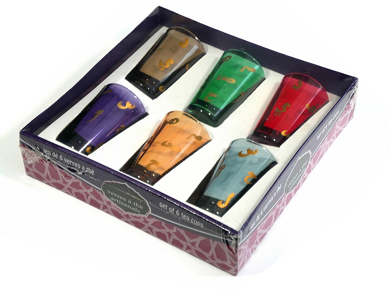 Verres à thé TUNIS colorés et ornés de motifs traditionnels dorés (Pack de 6 verres) - REF. 15943 (20.00 €)