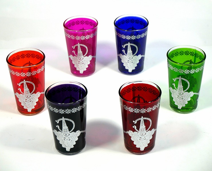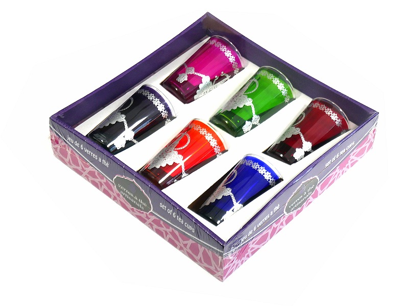 Verres à thé marocain CLASSIQUE colorés et ornés de motifs traditionnels dorés (Pack de 6 verres) - REF. 15941 (20.00 €)