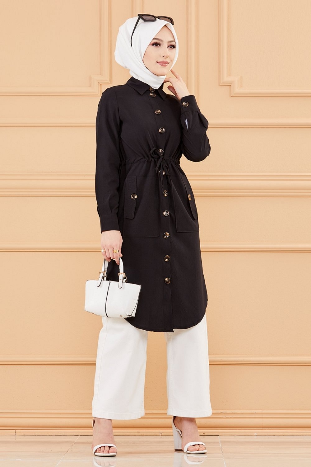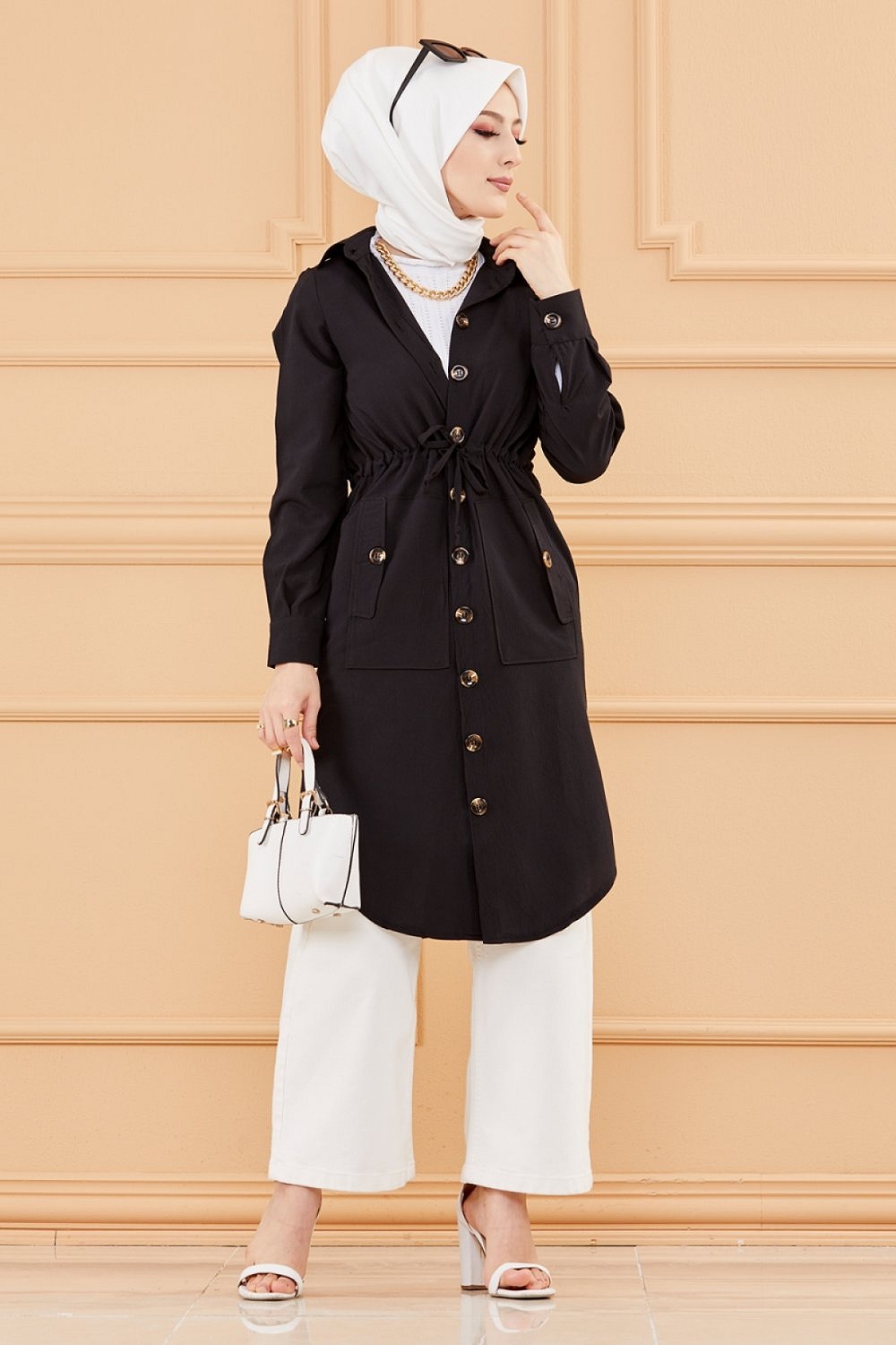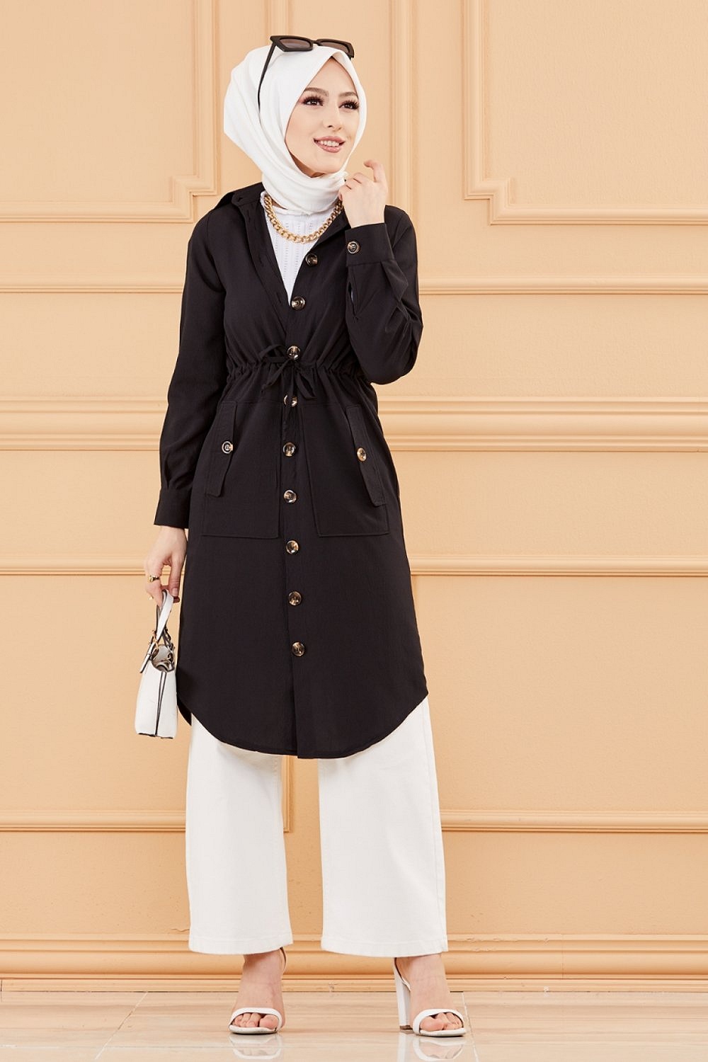 Veste - Tunique longue avec lien de serrage a la taille (Vetement femme voilee chic) - Couleur noir