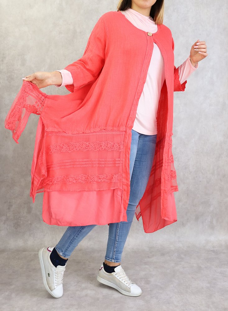 Veste mi longue, col rond, fermeture 1 bouton, manches 3/4, poches latérales. Coupe évasée, matière agréable et fluide, finition sur le bas d'une dentelle doublée.