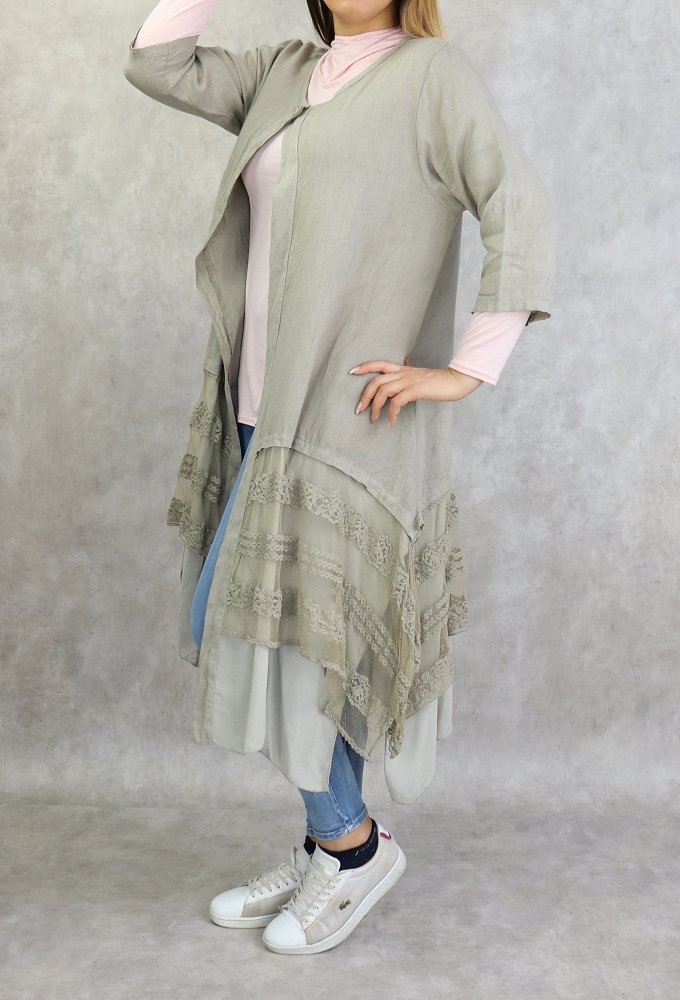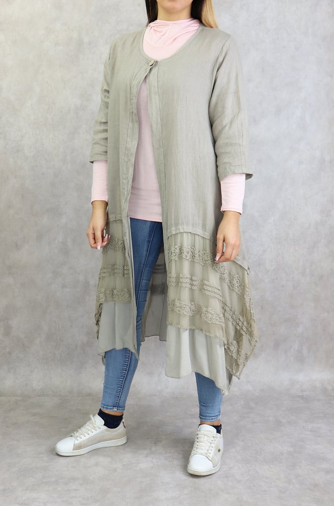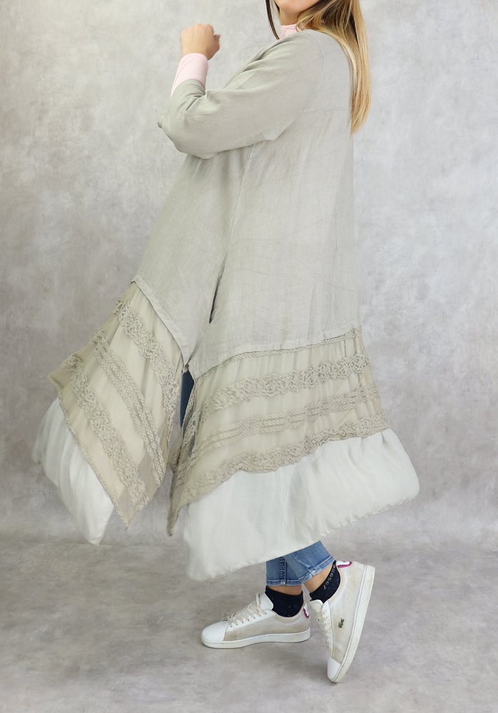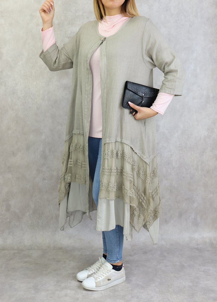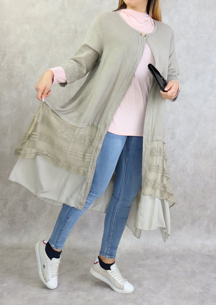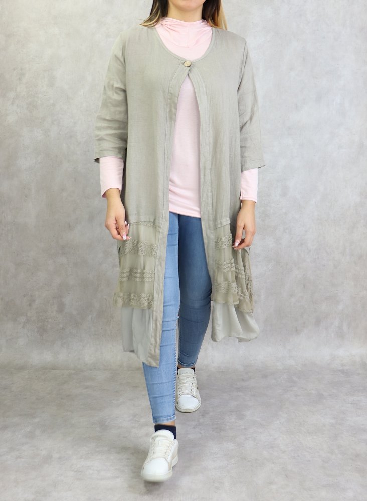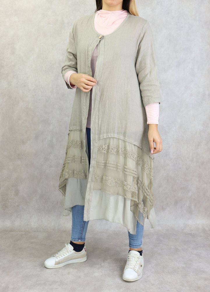Veste mi longue, col rond, fermeture 1 bouton, manches 3/4, poches latérales. Coupe évasée, matière agréable et fluide, finition sur le bas d'une dentelle doublée.