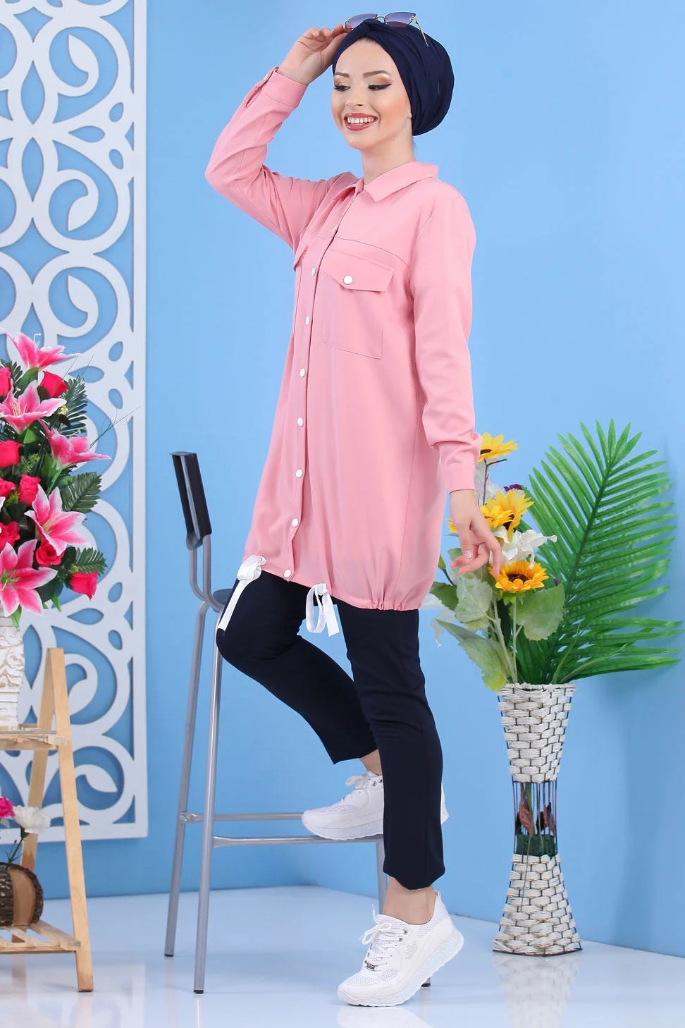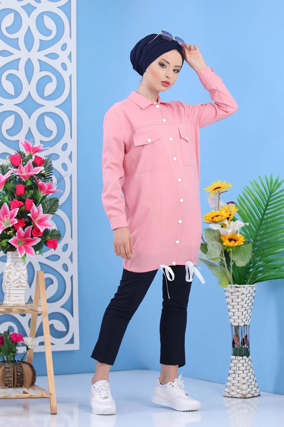Chemise mi-longue fluide ample légèrement brillante (Vetement femme voilée) - Couleur Bleu - REF. 32210 (26.90 €)