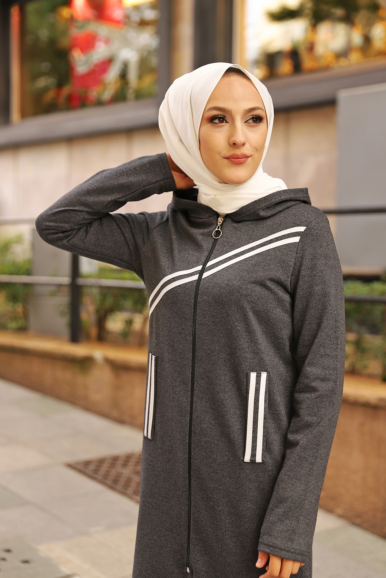 La veste sweat longue à capuche avec fermeture zippée aux fausses poches. Manches longues. Décoration deux bandes blanches.