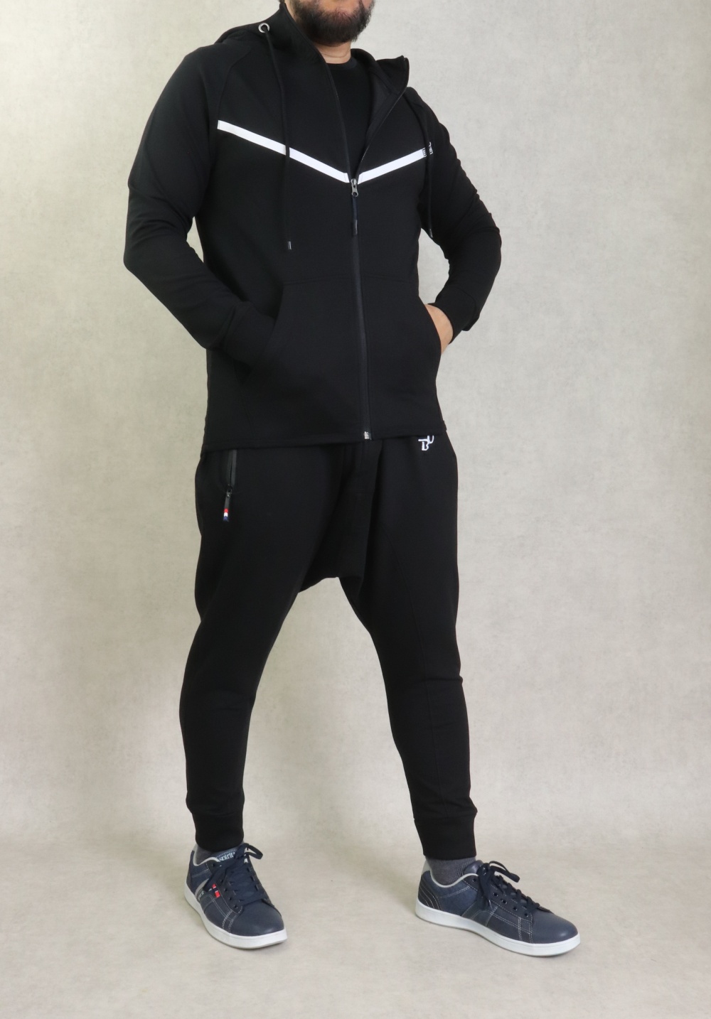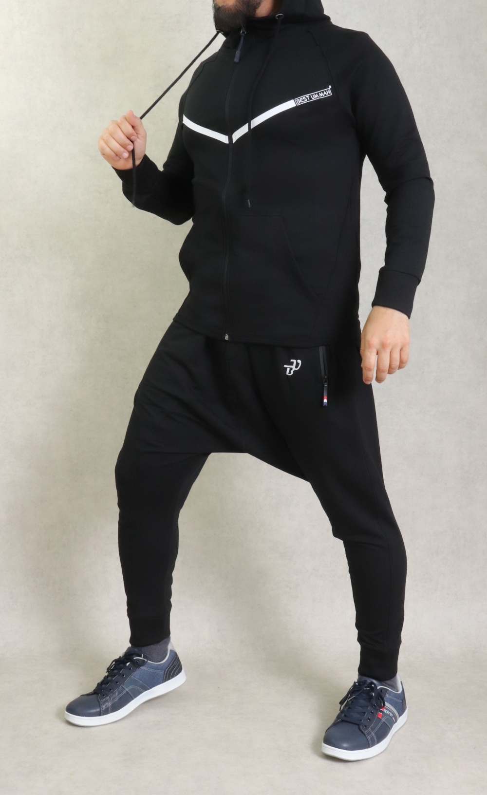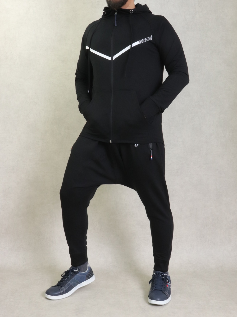 Pantalon Saroual Jogging molletonné poches zip blanches pour homme - Marque Best Ummah - Couleur noir - REF. 36843 (29.90 €)