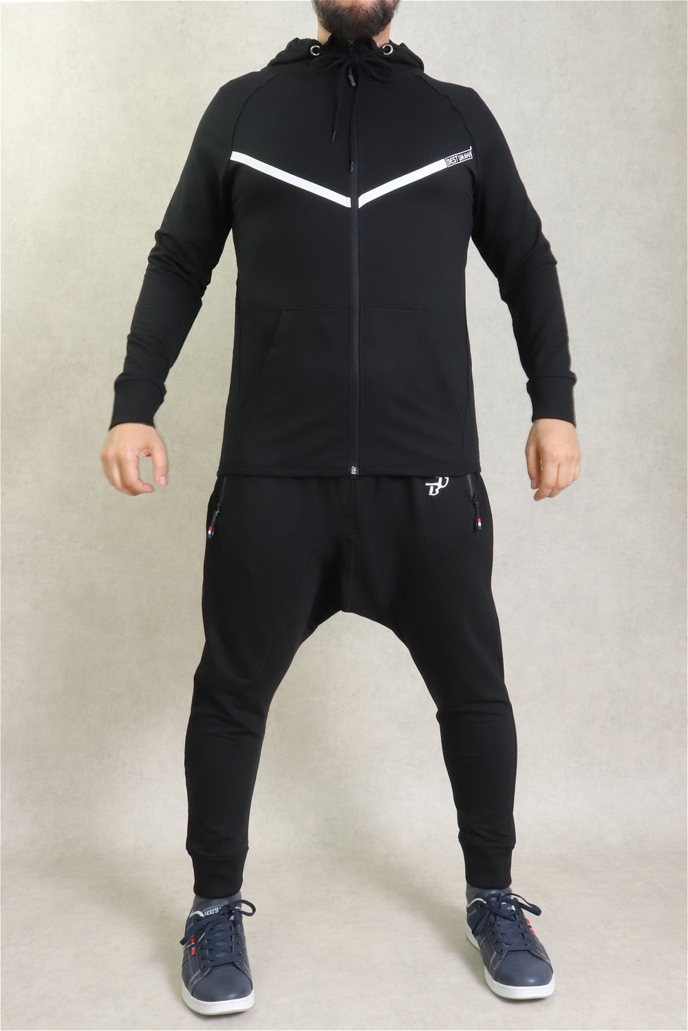 Ensemble jogging léger homme - Survêtement de Marque "Best Ummah" : Veste à bande et pantalon Seroual - Couleur noir - REF. 36449 (55.00 €)
