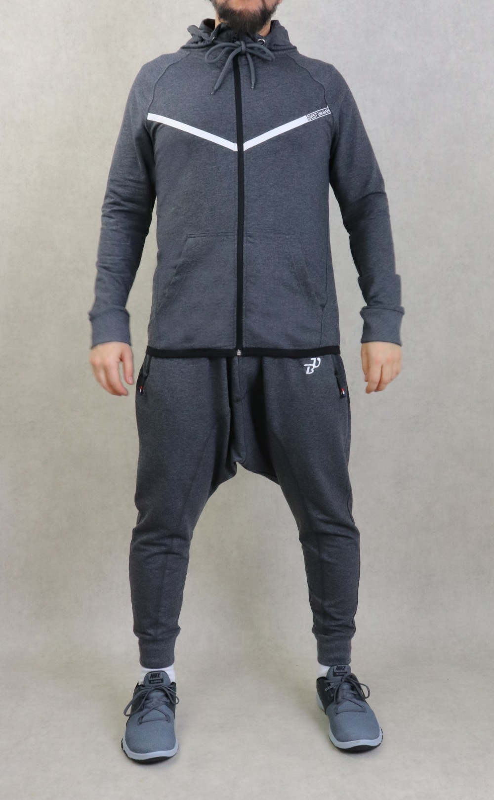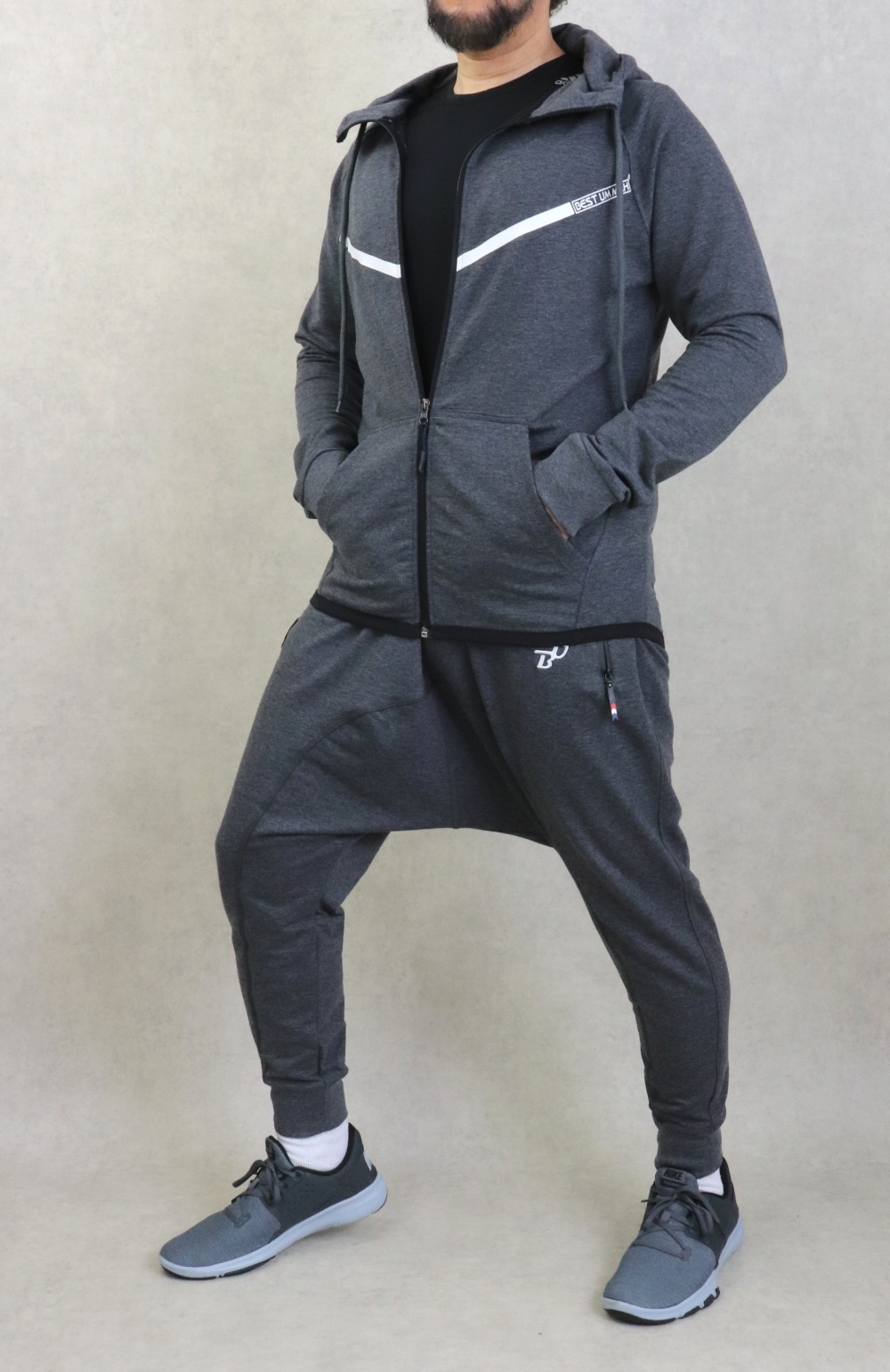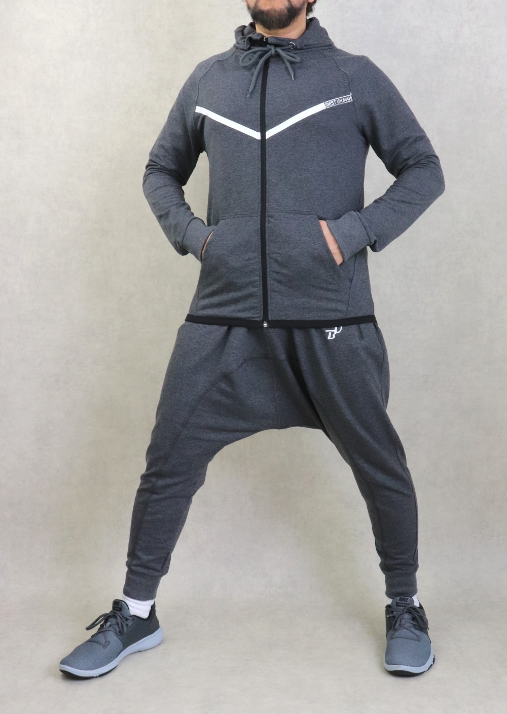 Veste couleur gris foncé chiné, plus longue à l'arrière qu'à l'avant avec bandes blanches et inscription BEST UMMAH. Bande noire au niveau du bas. Tissu léger de qualité doux. Deux poches sur les côtés. Capuche doublée avec cordon.