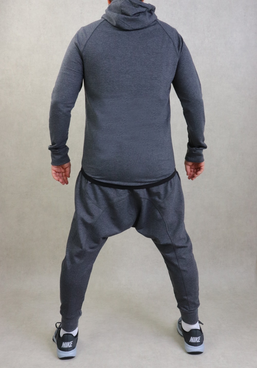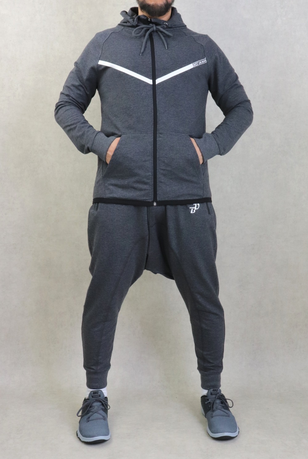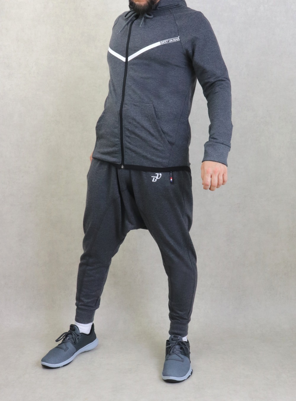 Veste couleur gris foncé chiné, plus longue à l'arrière qu'à l'avant avec bandes blanches et inscription BEST UMMAH. Bande noire au niveau du bas. Tissu léger de qualité doux. Deux poches sur les côtés. Capuche doublée avec cordon.
