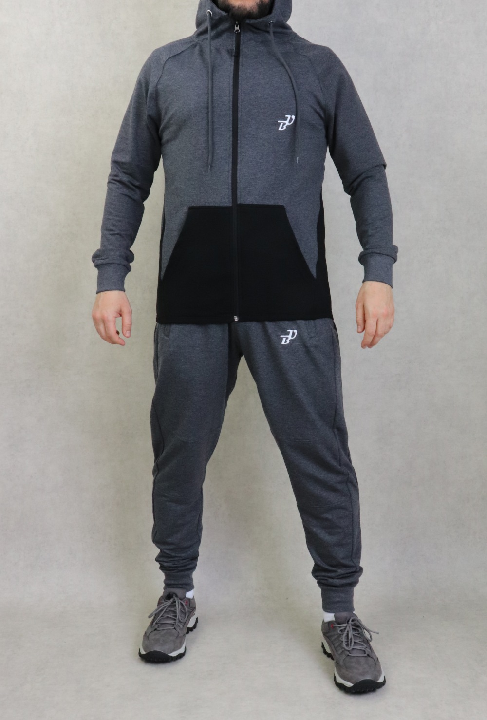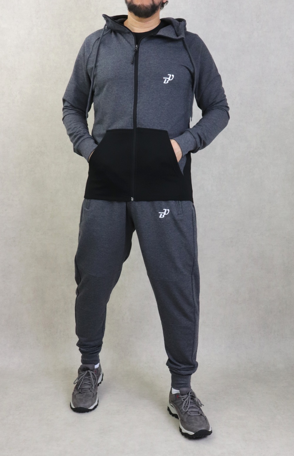 Veste bicolore grise et noire, plus longue à l'arrière qu'à l'avant. Tissu molletonné de qualité doux et qui tient chaud. Deux poches sur les côtés. Capuche doublée avec cordon.