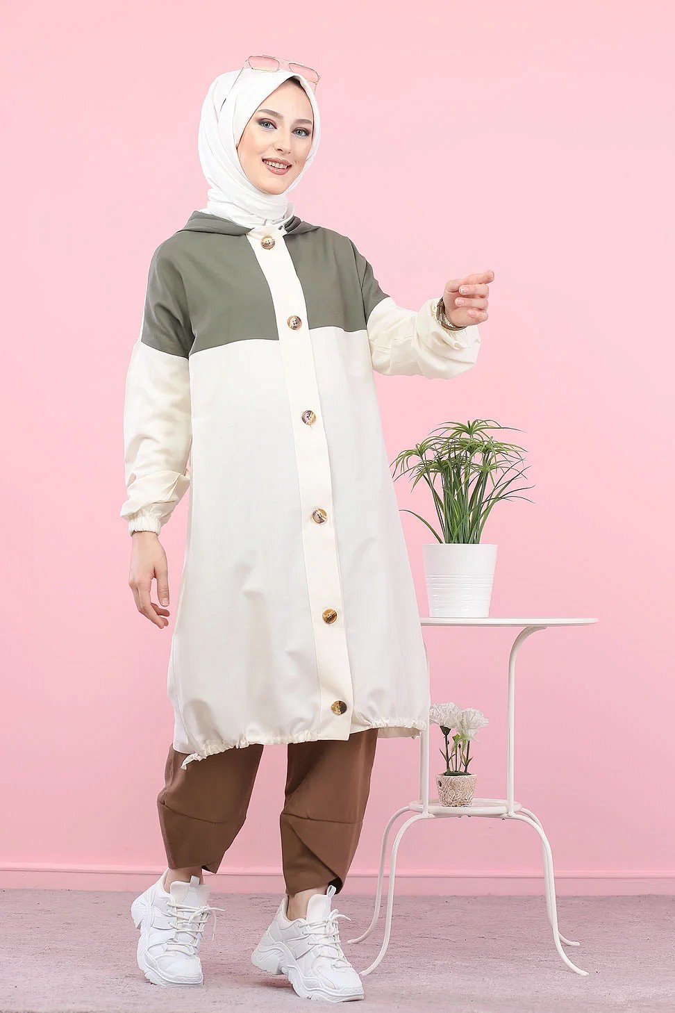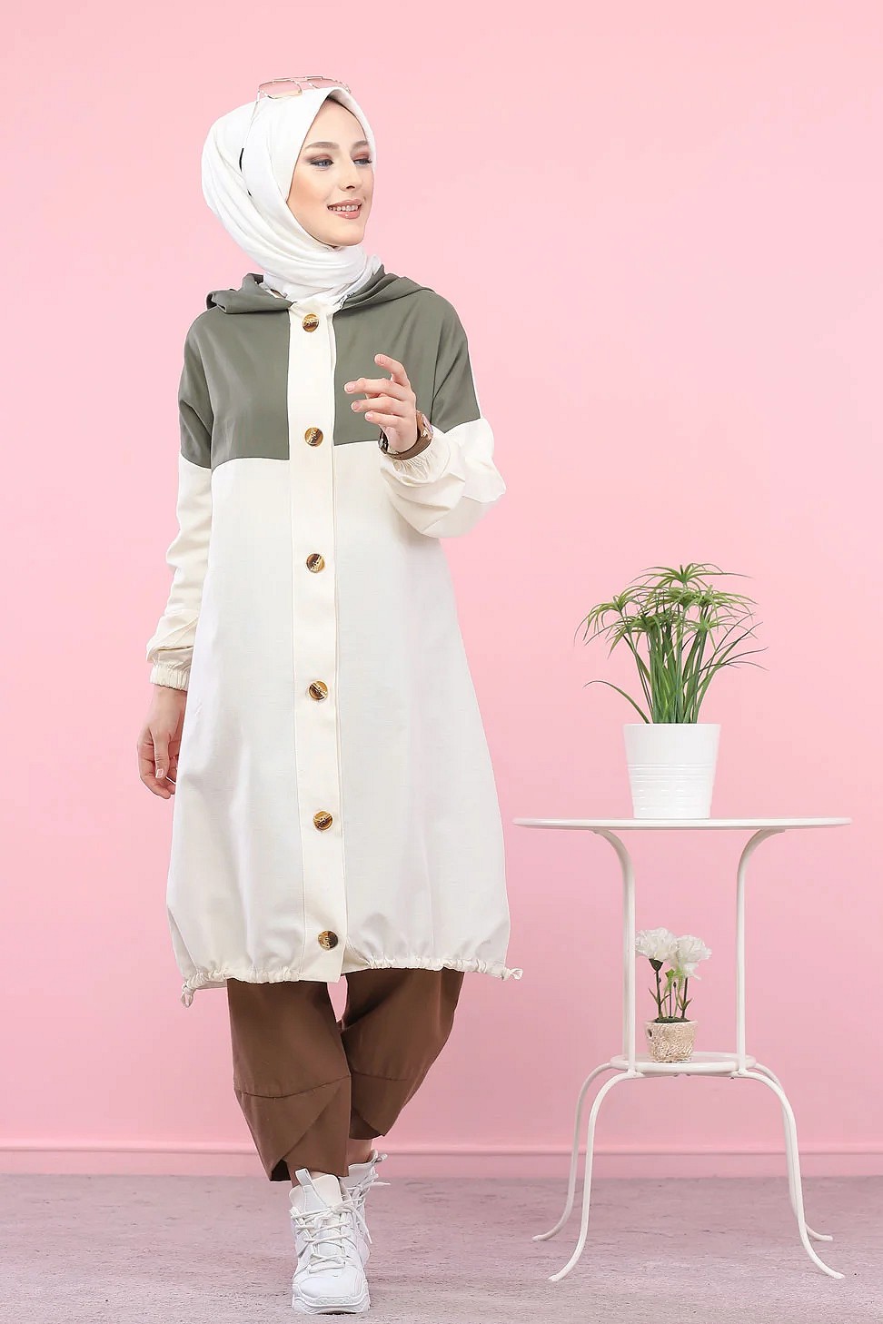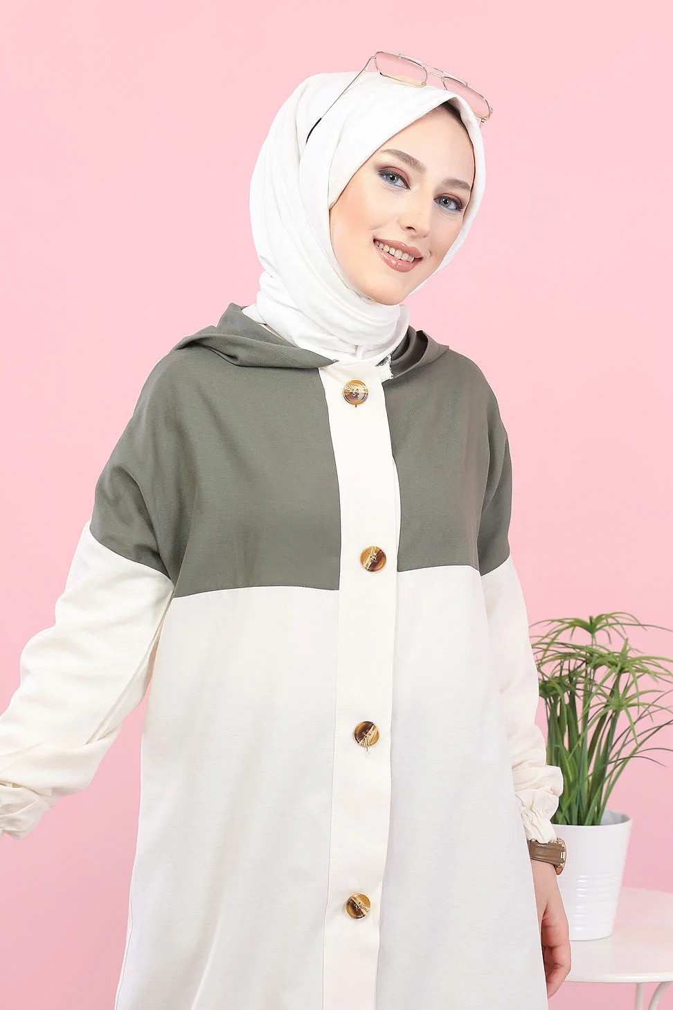 Robe-manteau boutonnée avec grandes poches et capuche (Vêtement mastour pour hijab) - Couleur kaki - REF. 36373 (29.90 €)