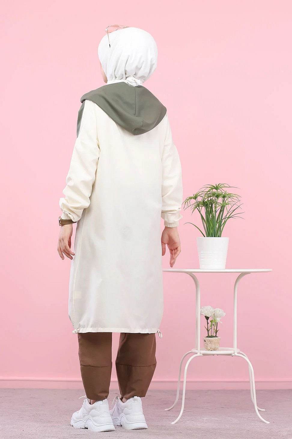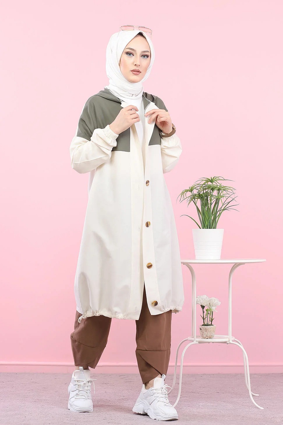 Veste longue bicolore à capuche (Vetement islamique pour femme) - Couleur blanc et kaki Vetement & Accessoire