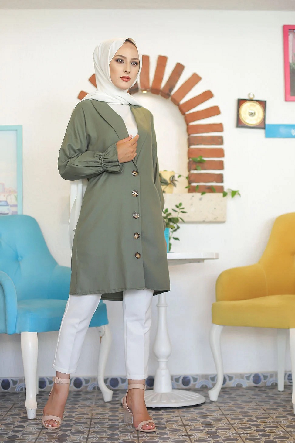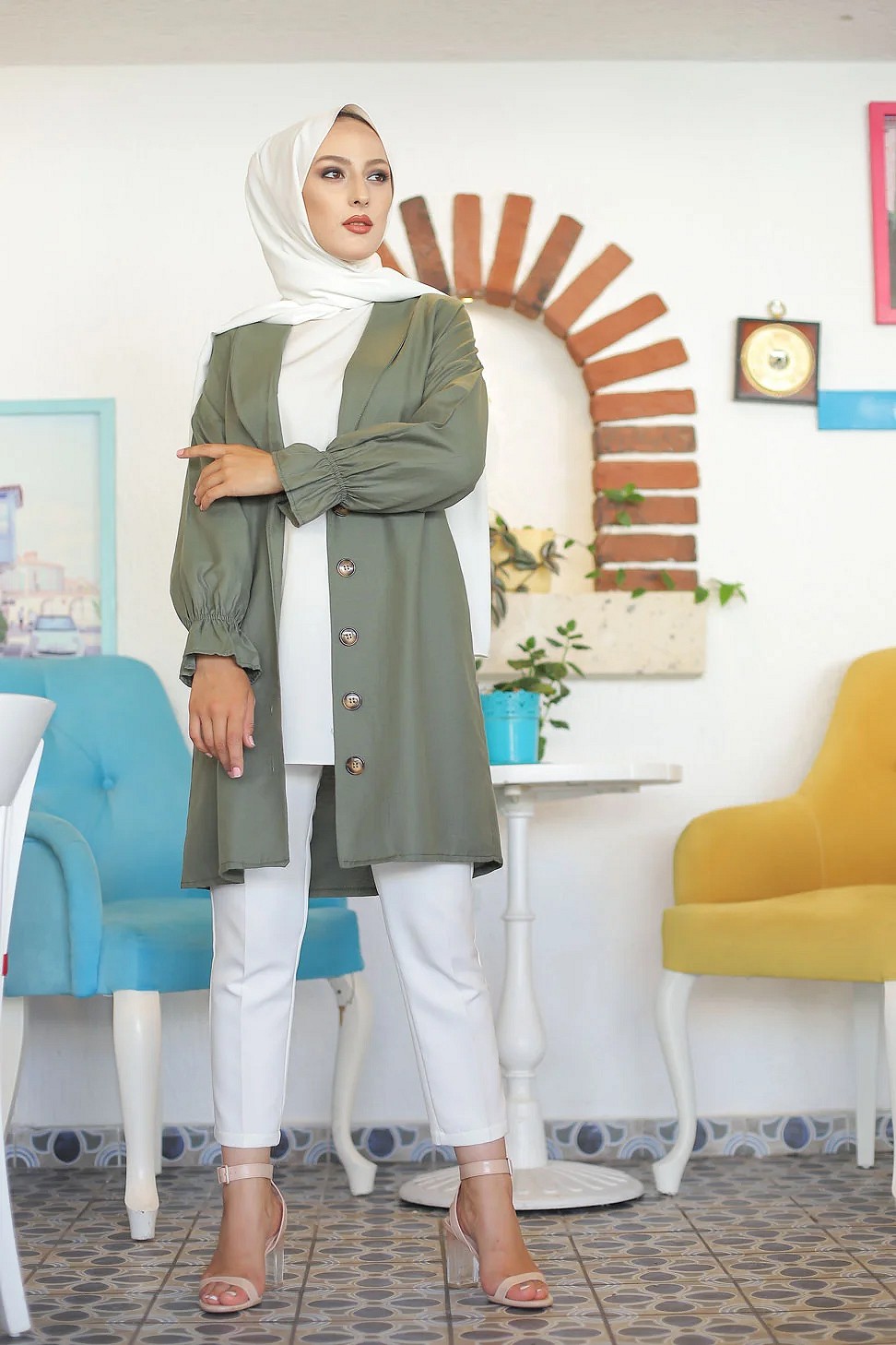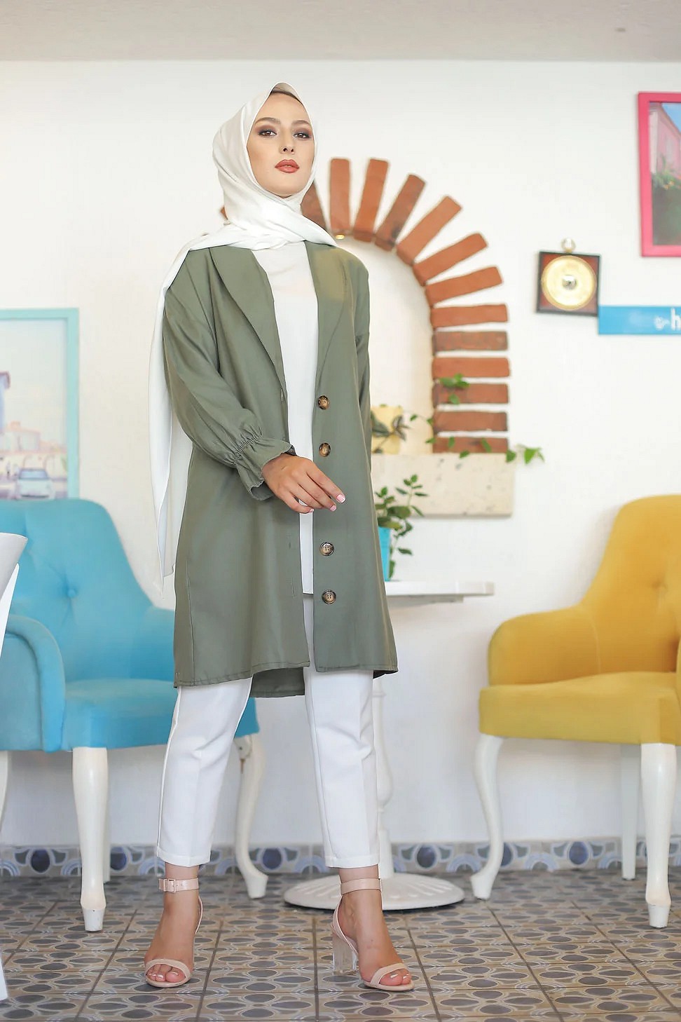 Veste longue classique boutonnee elegante (Vetement Hijab pour femme voilee) - Couleur kaki