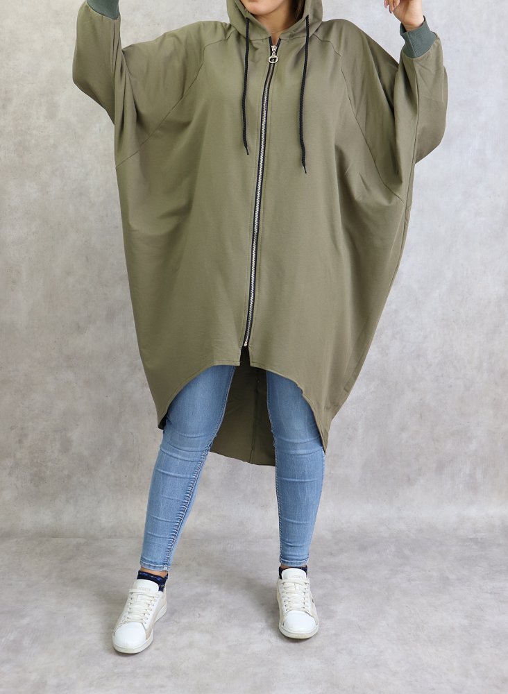 Veste longue, capuche avec lien, manches papillon, fermeture zip, matière sweat.
