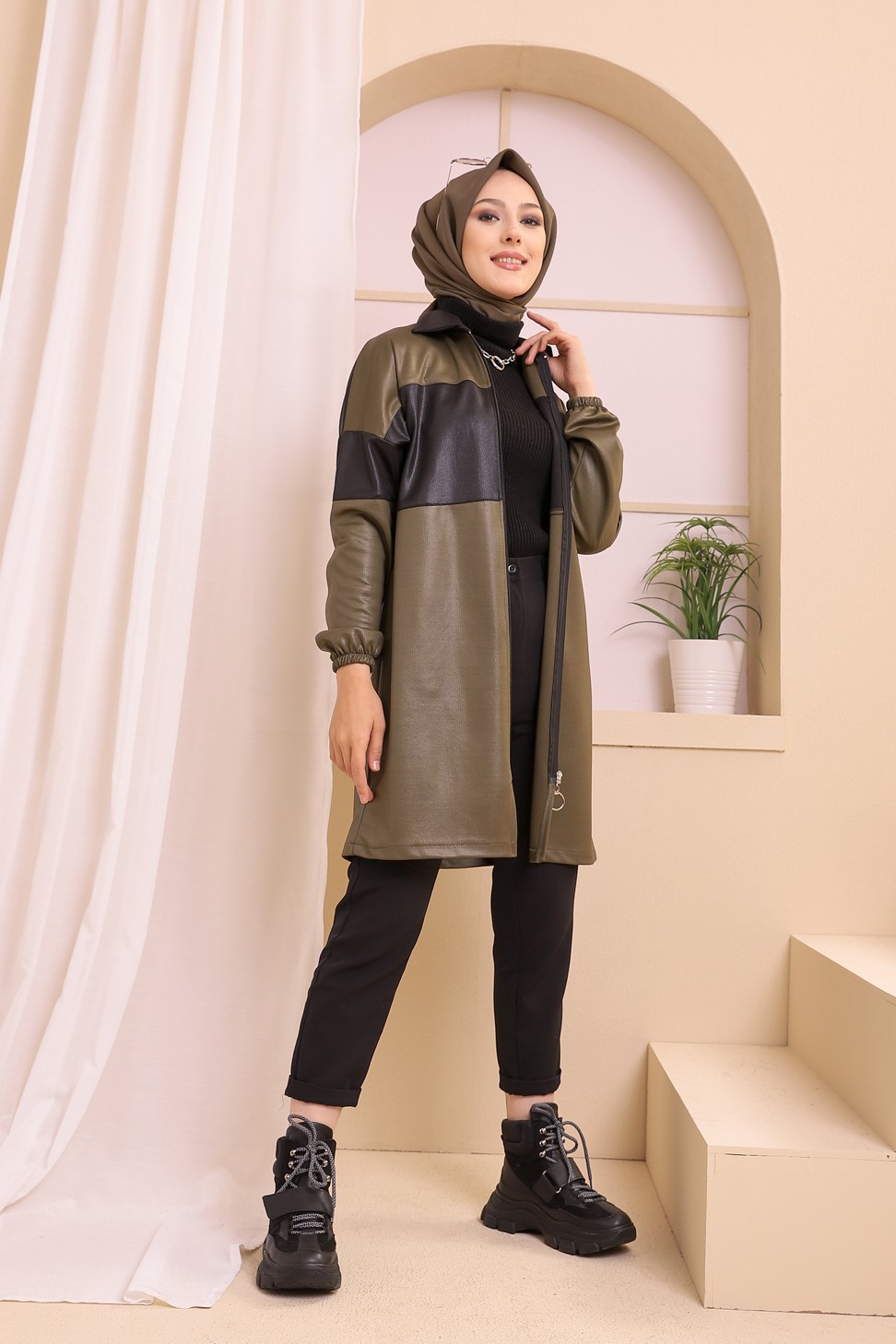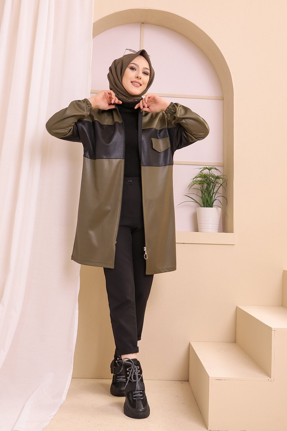 Veste tunique zippee en skai simili-cuir pour femme (Vetement Hijab Automne Hiver Style) - Couleur kaki