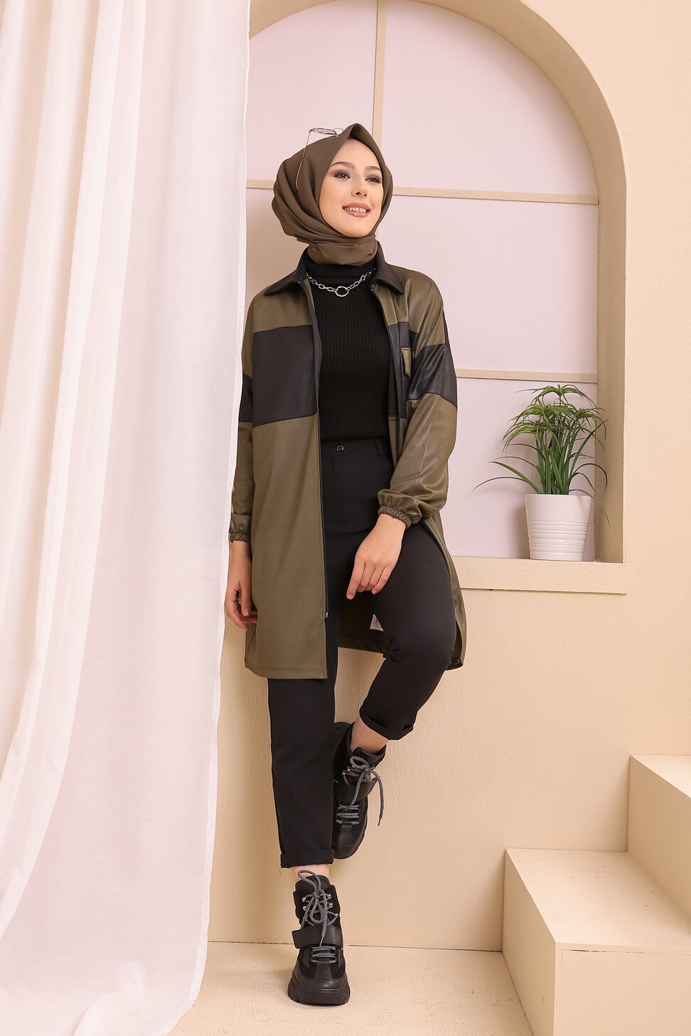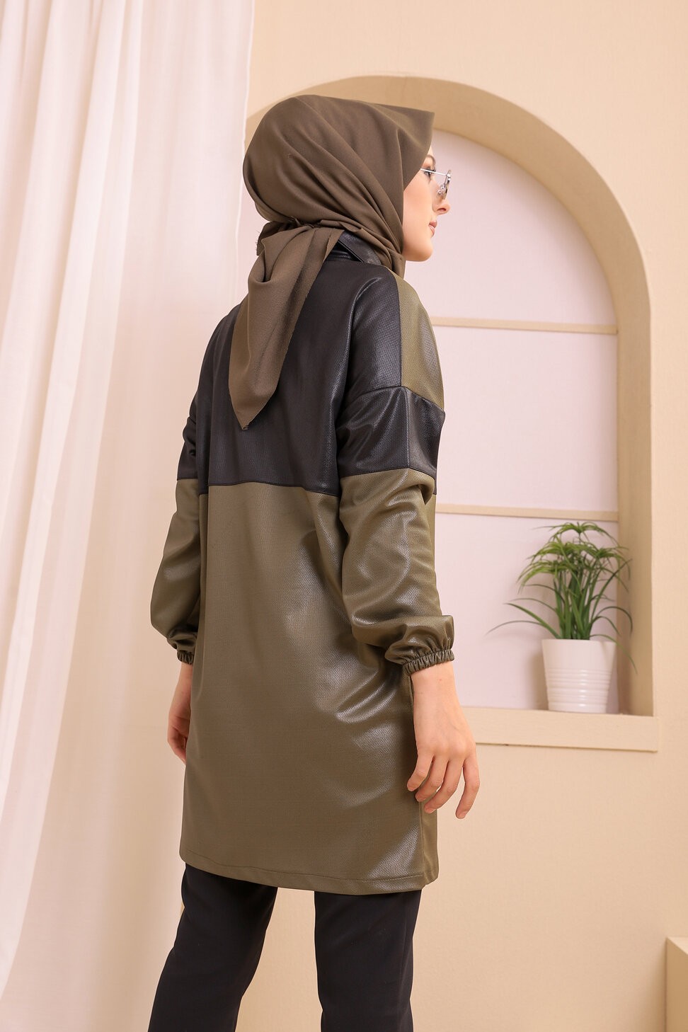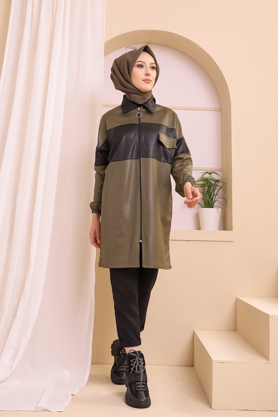 Veste tunique zippée en skaï simili-cuir pour femme (Vêtement Hijab Automne Hiver Style) - Couleur kaki Vetement & Accessoire