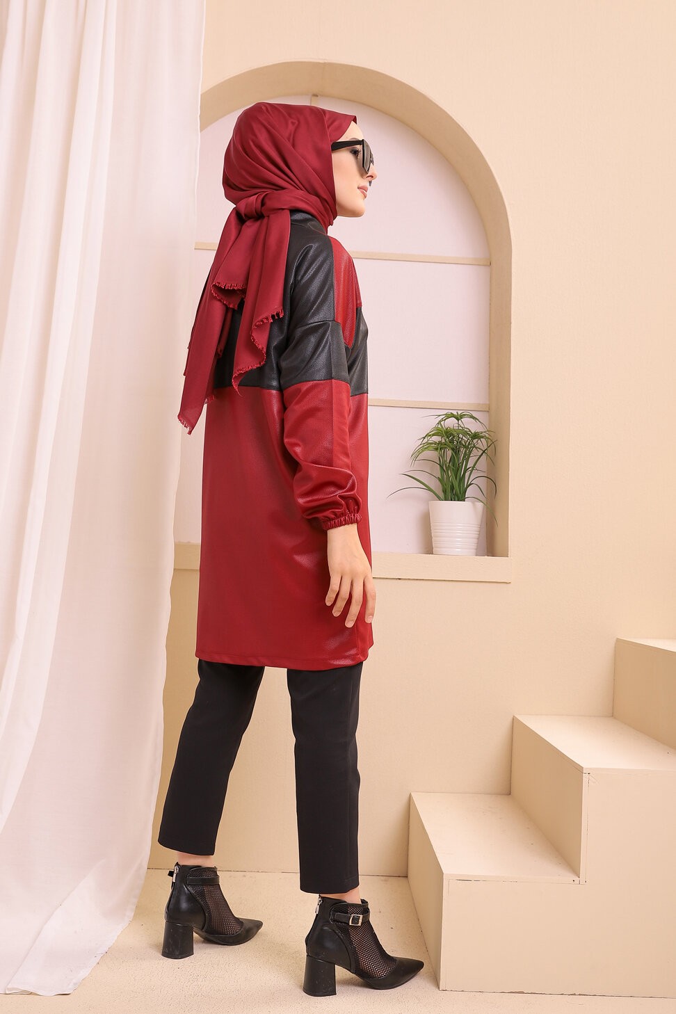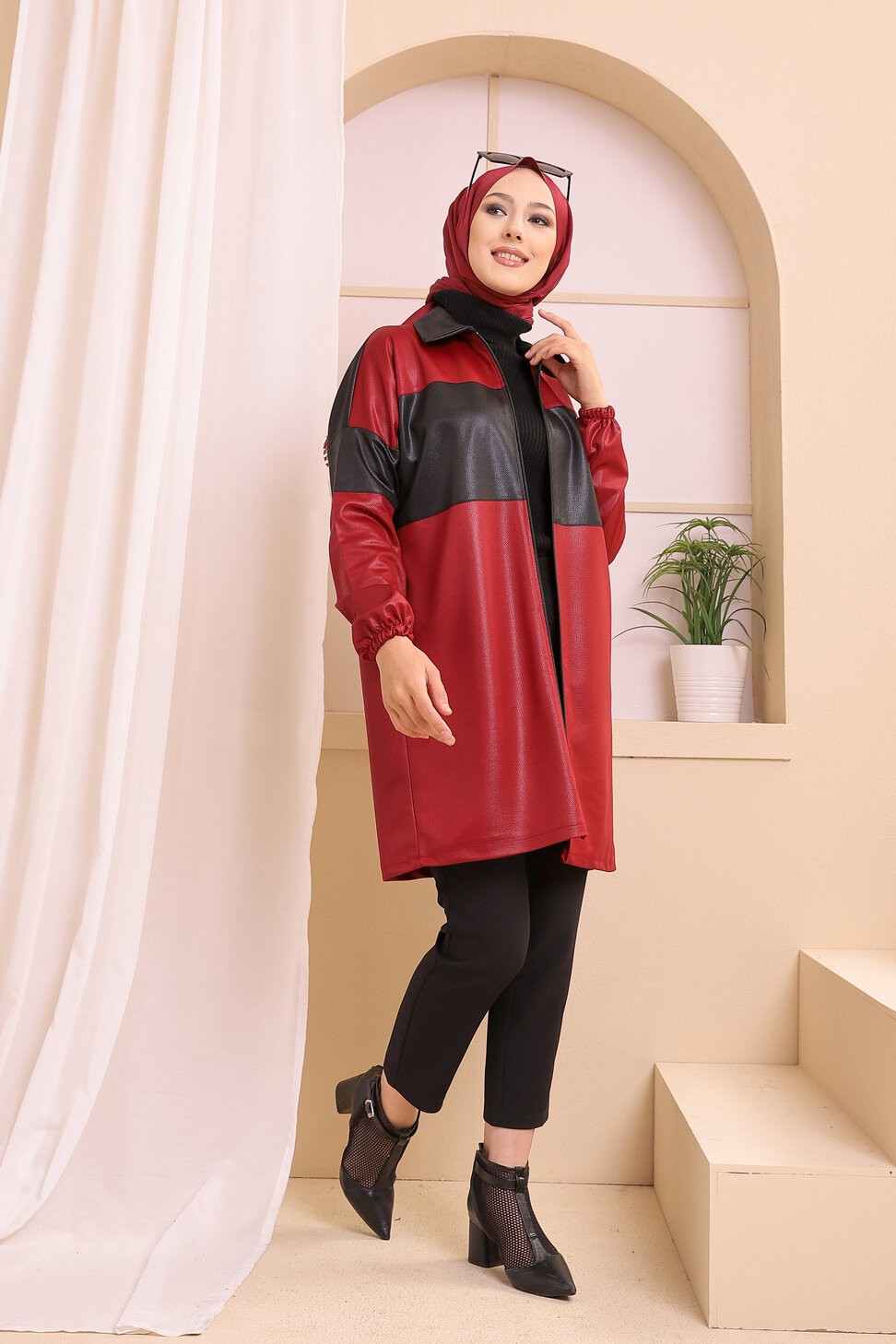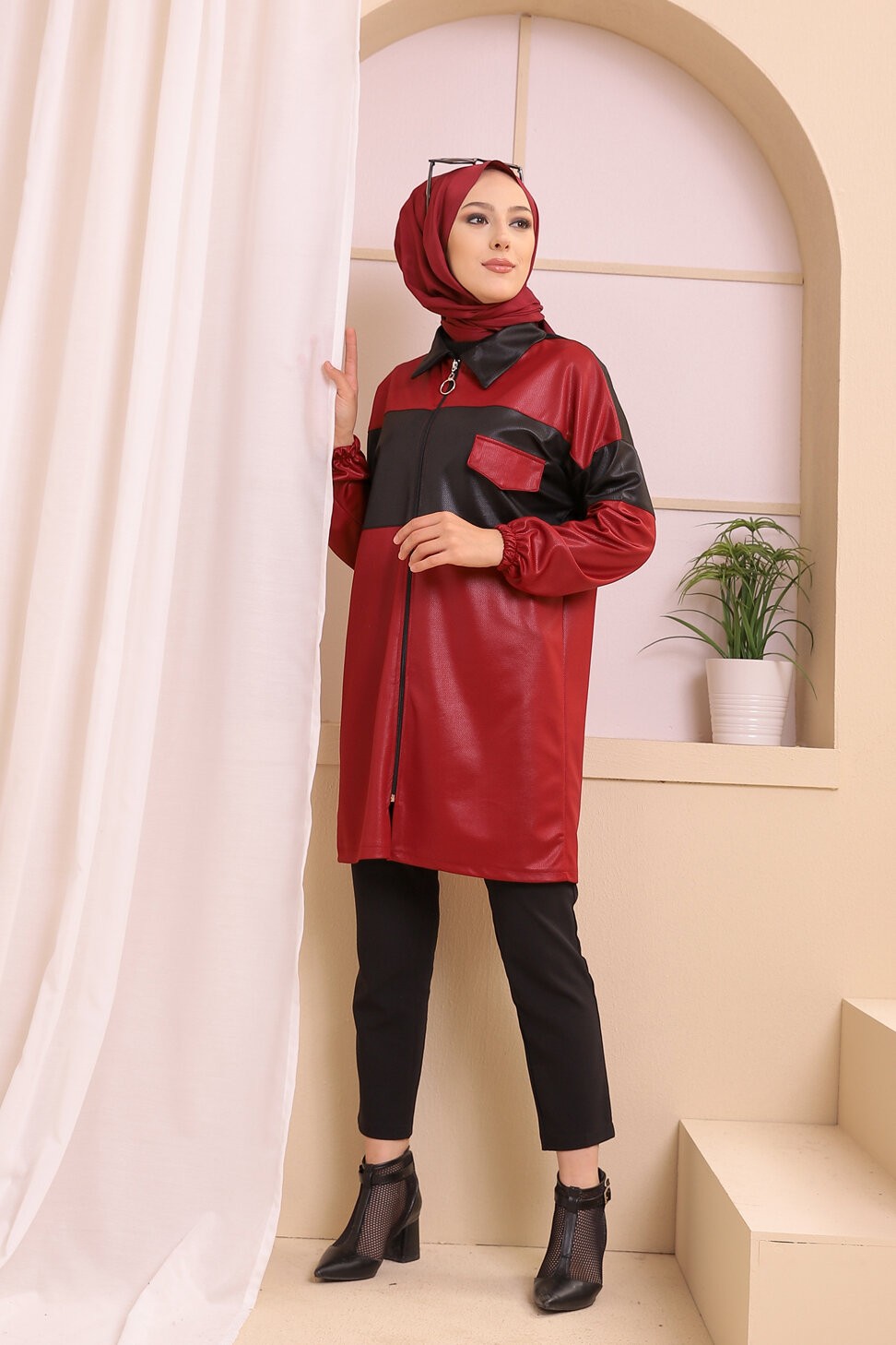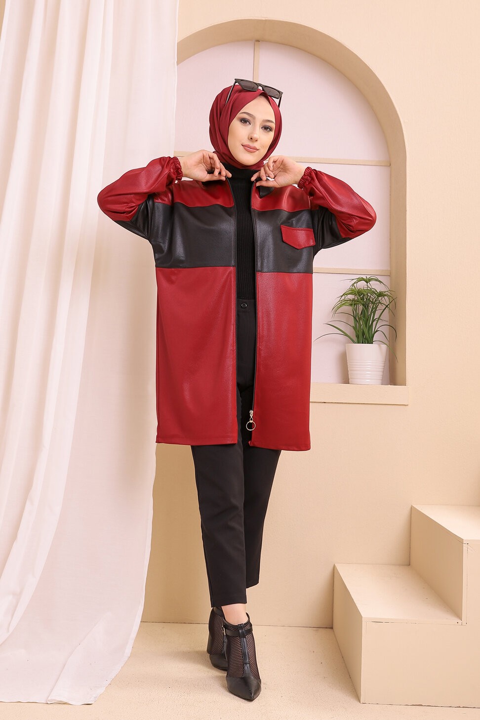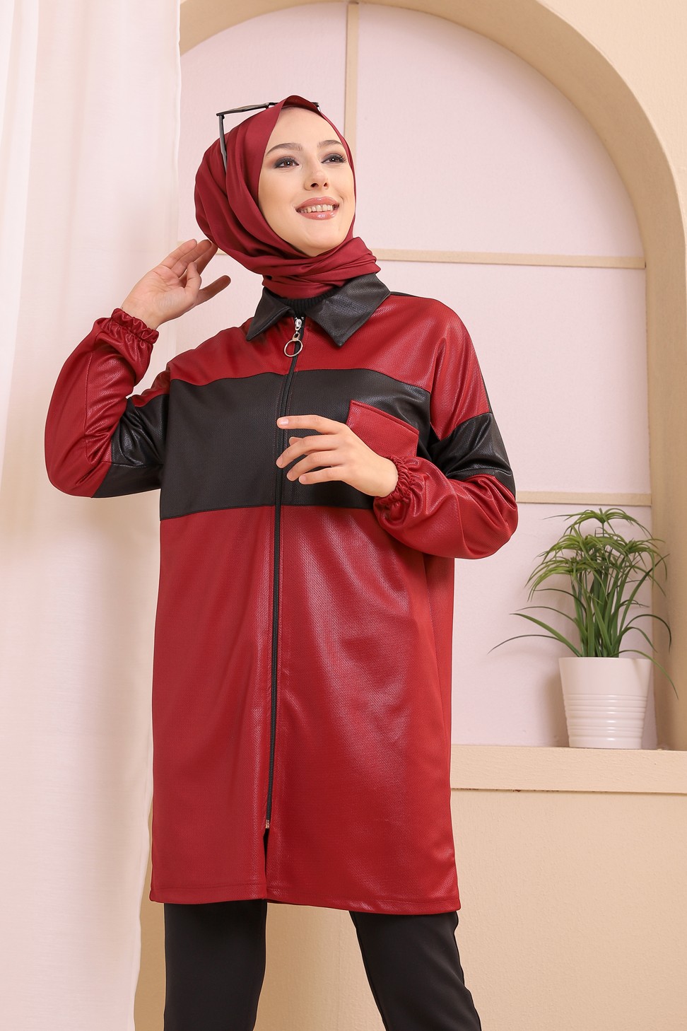 Veste zippée en skaï simili-cuir pour femme (Prêt-à-porter Hijab Automne Hiver Style) - Couleur bordeaux Vetement & Accessoire