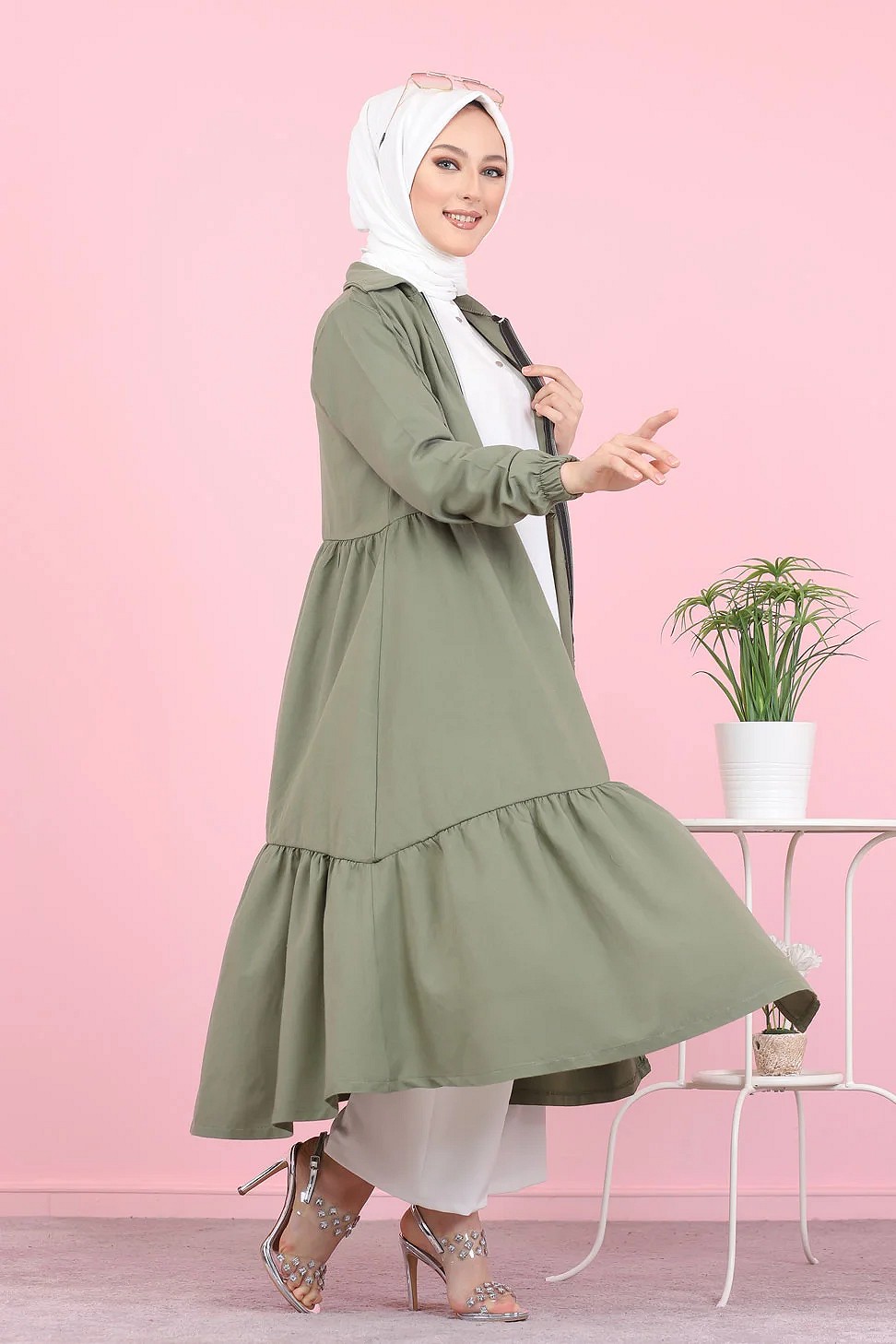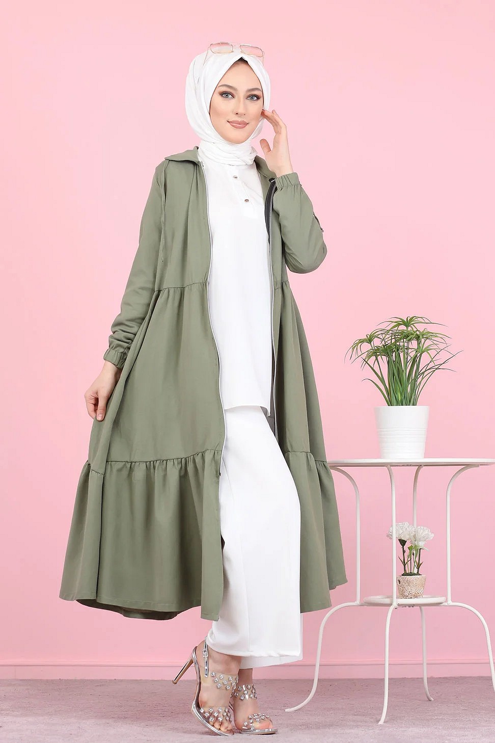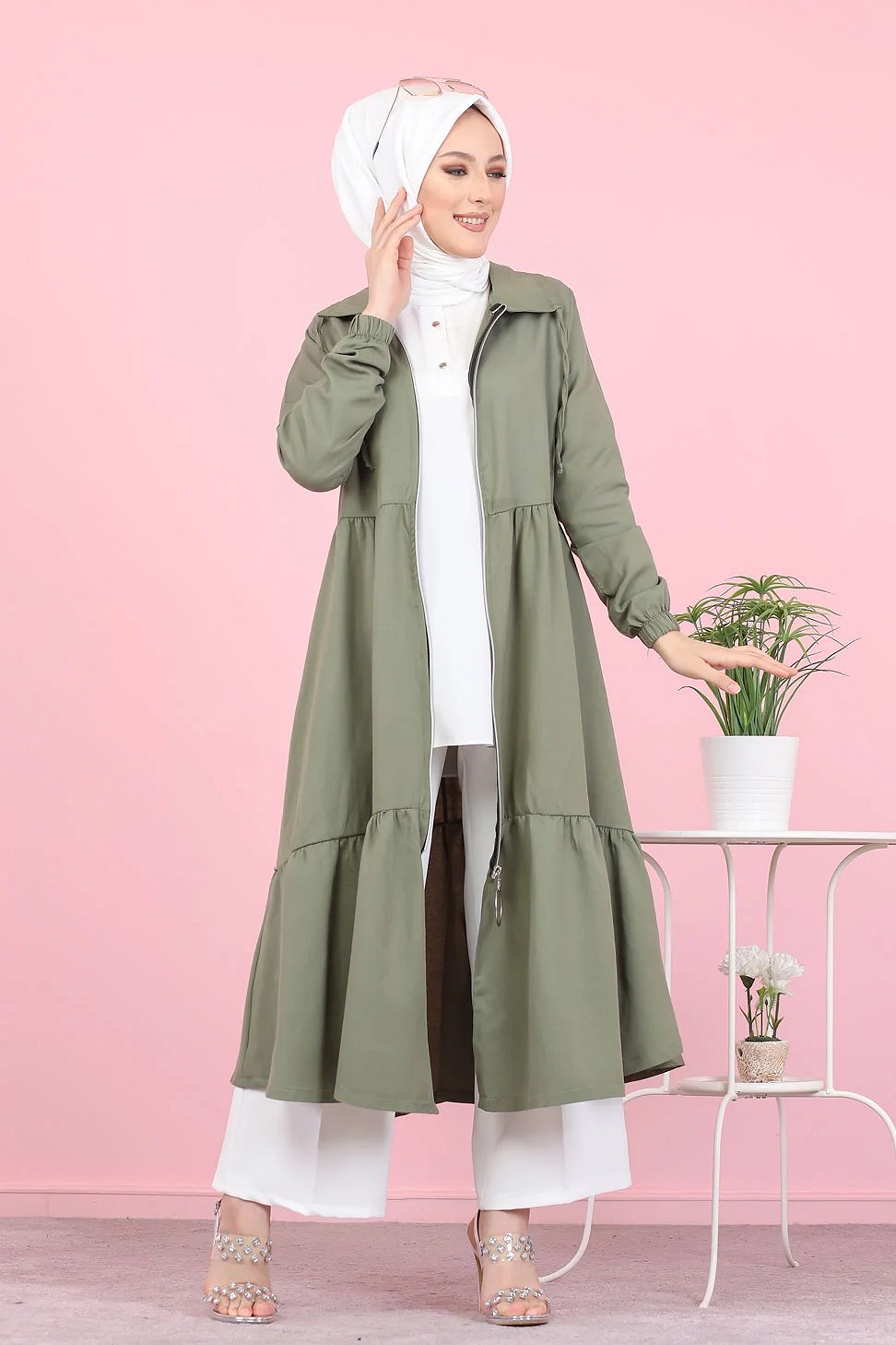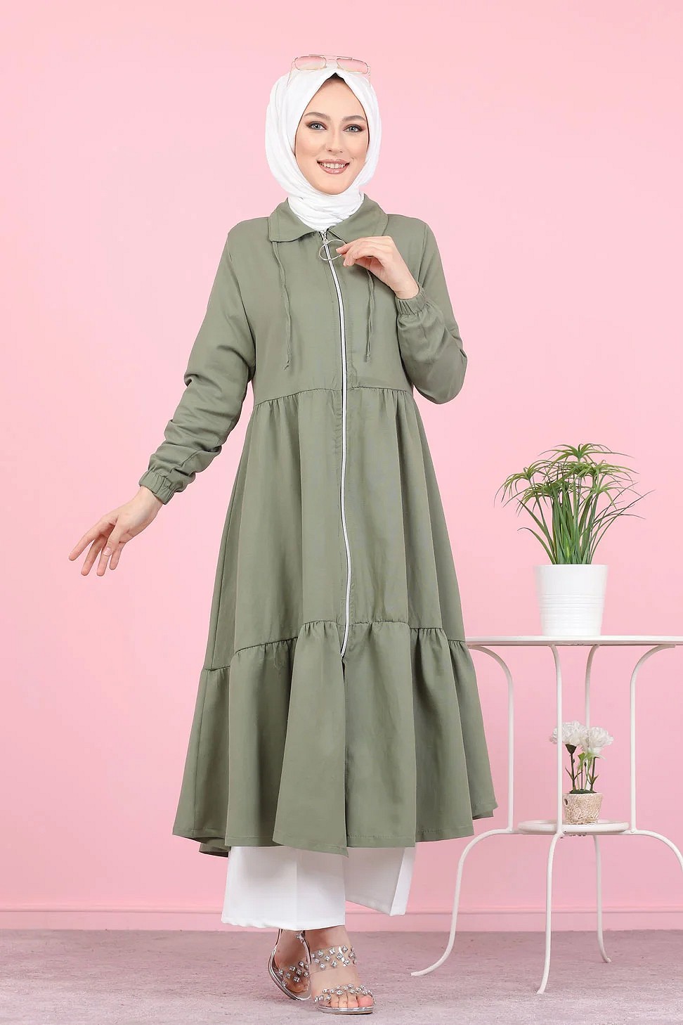 Veste zippee legere mi longue (Vetement ample pour femme voilee) - Couleur kaki