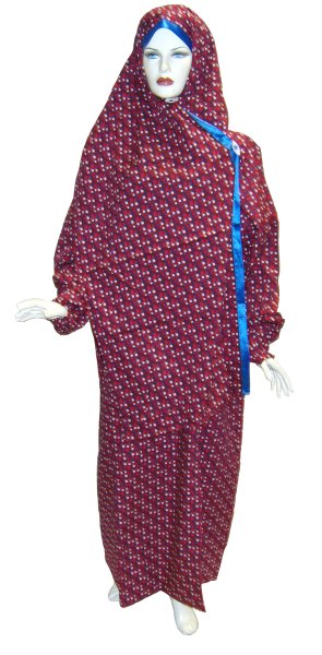 Pratique d'utilisation, car rapide à mettre et couvre bien tout le corps. Existe en deux modèles le premier en une seule pièce avec de jolies motifs en couleur (le voile est cousu à la robe). Le second en deux pièces (cape + jupe) avec légers motifs argentés.